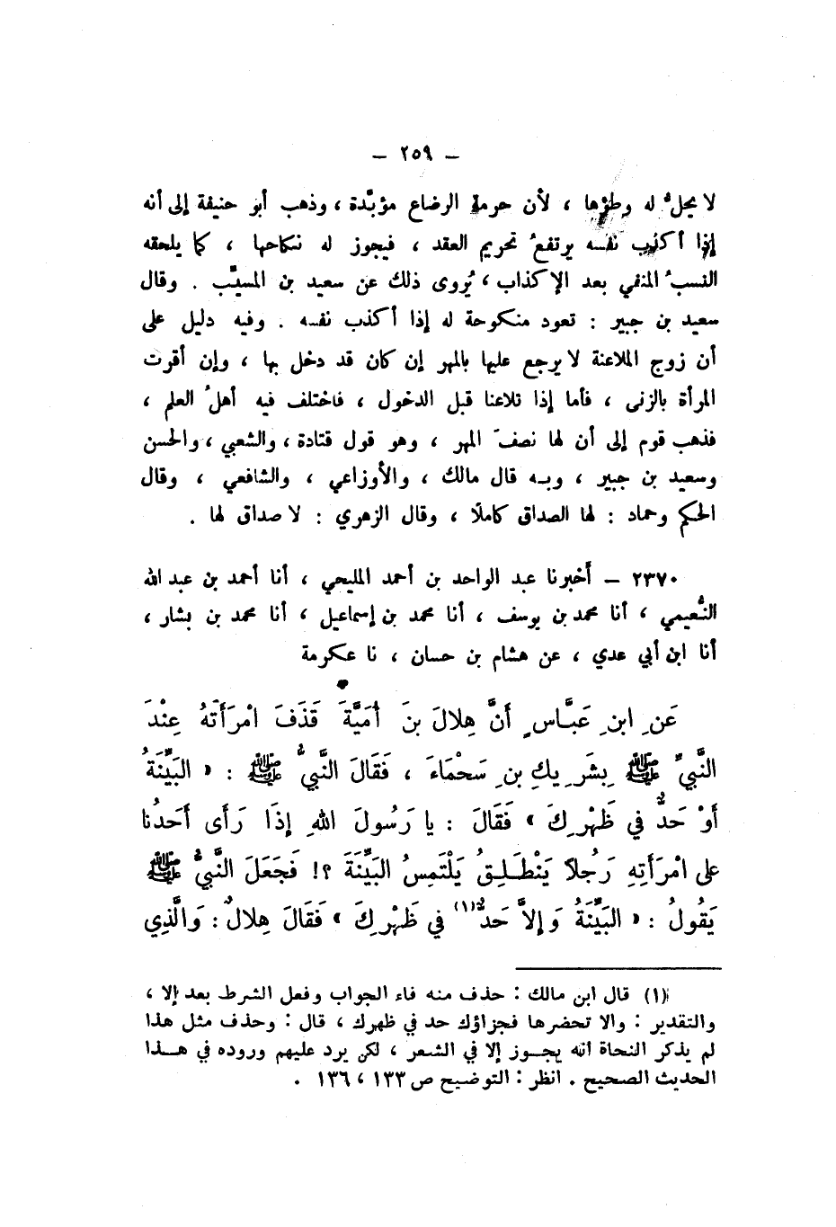 2370 - أَخْبَرَنَا عَبْدُ الْوَاحِدِ بْنُ أَحْمَدَ الْمَلِيحِيُّ، أَنا أَحْمَدُ بْنُ عَبْدِ اللَّهِ النُّعَيْمِيُّ، أَنا مُحَمَّدُ بْنُ يُوسُفَ، أَنا مُحَمَّدُ بْنُ إِسْمَاعِيلَ، أَنا مُحَمَّدُ بْنُ بَشَّارٍ، أَنا ابْنُ أَبِي عَدِيٍّ، عَنْ هِشَامِ بْنِ حَسَّانٍ، نَا عِكْرِمَةُ، عَنِ ابْنِ عَبَّاسٍ، أَنَّ هِلالَ بْنَ أُمَيَّةَ قَذَفَ امْرَأَتَهُ عِنْدَ النَّبِيِّ صَلَّى اللهُ عَلَيْهِ وَسَلَّمَ بِشَرِيكِ بْنِ سَحْمَاءَ، فَقَالَ النَّبِيُّ صَلَّى اللهُ عَلَيْهِ وَسَلَّمَ: «الْبَيِّنَةُ أَوْ حَدٌّ فِي ظَهْرِكَ».