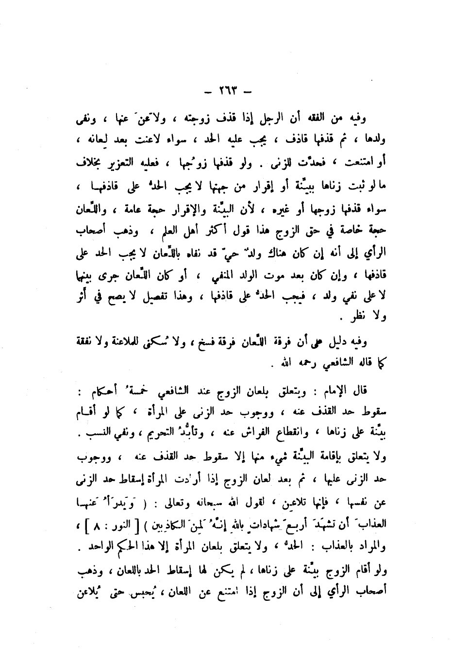 قَالَ الإِمَامُ: وَيتَعَلَّق بِلعان الزَّوْج عِنْد الشَّافِعِيّ خمسةُ أَحْكَام: سُقُوط حد الْقَذْف عَنْهُ، وَوُجُوب حد الزِّنَى على الْمَرْأَة، كَمَا لَو أَقَامَ بيِّنة على زنَاهَا، وَانْقِطَاع الْفراش عَنْهُ، وتأبُّدُ التَّحْرِيم، وَنفي النّسَب.