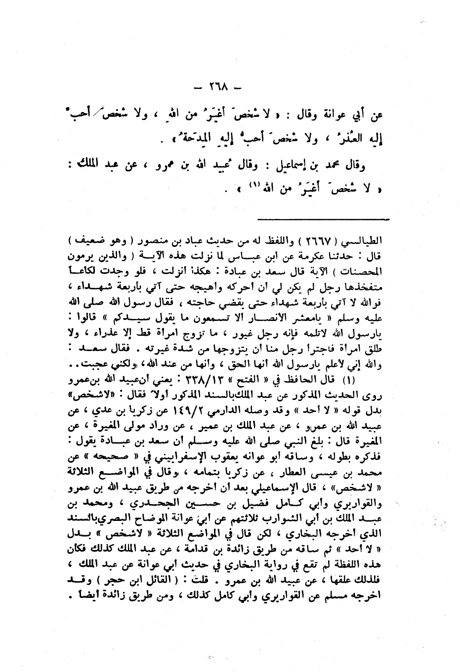 وَقَالَ مُحَمَّدُ بْنُ إِسْمَاعِيلَ: وَقَالَ عُبَيْدُ اللَّهِ بْنُ عَمْرٍو، عَنْ عَبْدِ الْمَلِكِ: «لَا شَخْصَ أَغْيَرُ مِنَ اللَّهِ»