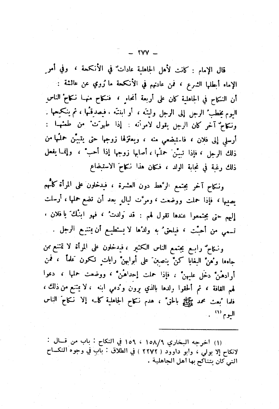 قَالَ الإِمَامُ: كَانَت لأهل الْجَاهِلِيَّة عاداتٌ فِي الْأَنْكِحَة، وَفِي أَمر الْإِمَاء، أبطلها الشَّرْع، فَمن عَادَتهم فِي الْأَنْكِحَة مَا رُوي عَنْ عَائِشَة أَن النِّكَاح فِي الْجَاهِلِيَّة كَانَ على أَرْبَعَة أنحاء: فنكاح مِنْهَا نكاحُ النَّاس الْيَوْم يخطبُ الرجل إِلَى الرجل وليتَه، أَو ابْنَته، فيصدقُها، ثُمَّ ينكِحها، ونكاحٌ آخر، كَانَ الرجل يَقُول لامْرَأَته إِذا طهرتْ من طمثها: أرسلي إِلَى فلَان، فاستبضعي مِنْهُ، ويعتزلها زَوجهَا حَتَّى يتبيَّن حملُها من ذَلِكَ الرجل، فَإِذا تبيَّن حملُها، أَصَابَهَا زَوجهَا إِذا أحبَّ، وَإِنَّمَا يفعل ذَلِكَ رَغْبَة فِي نجابة الْوَلَد، فَكَانَ هَذَا نكاحَ الاستبضاع.