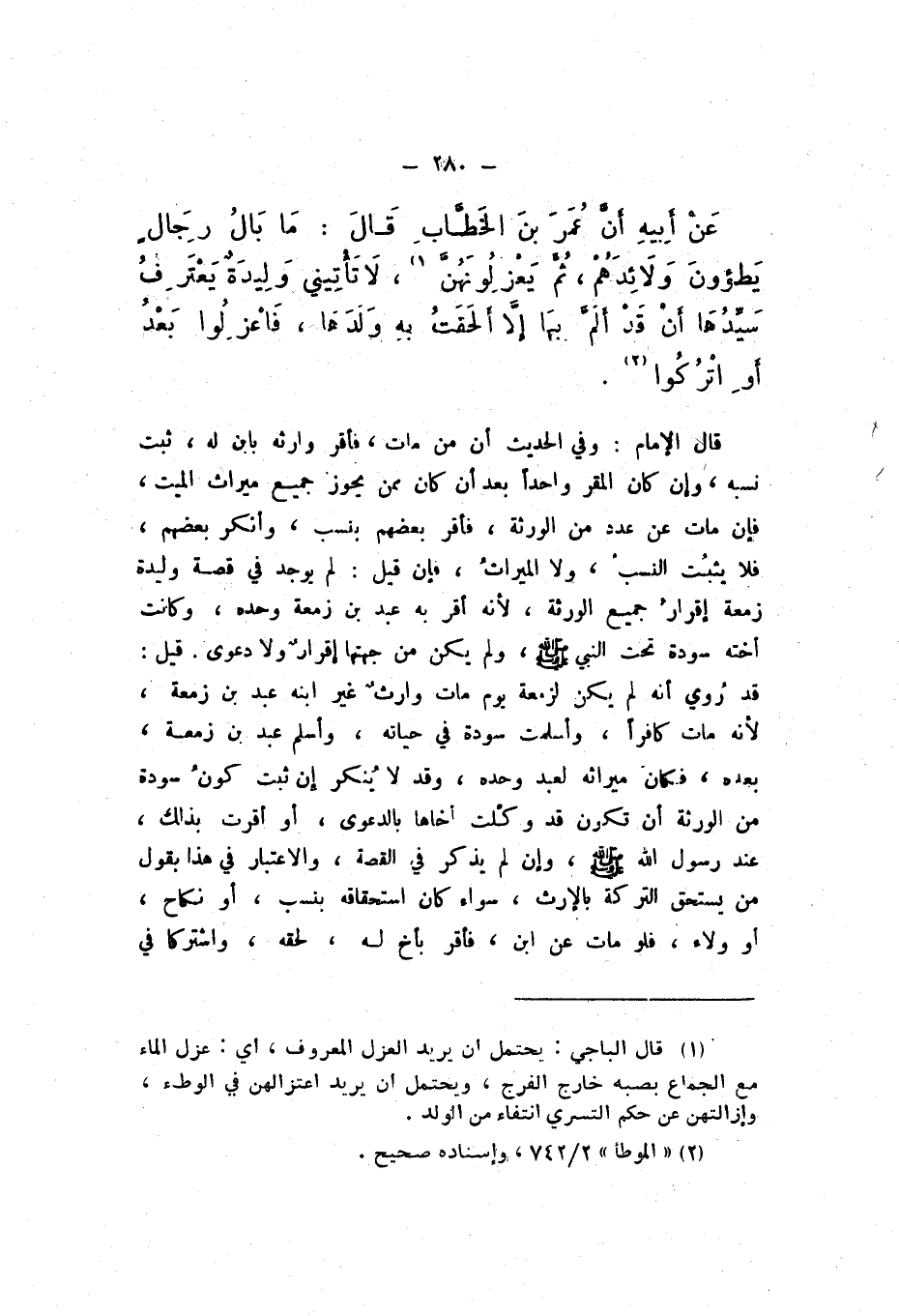 عَنْ أَبِيهِ، أَنَّ عُمَرَ بْنَ الْخَطَّابِ، قَالَ: «مَا بَالُ رِجَالٍ يَطَئُونَ وَلائِدَهُمْ، ثُمَّ يَعْزِلُونَهُنَّ، لَا تَأْتِينِي وَلِيدَةٌ يَعْتَرِفُ سَيِّدُهَا أَنْ قَدْ أَلَمَّ بِهَا إِلا أَلْحَقْتُ بِهِ وَلَدَهَا، فاعْزِلُوا بَعْدُ، أَوِ اتْرُكُوا»