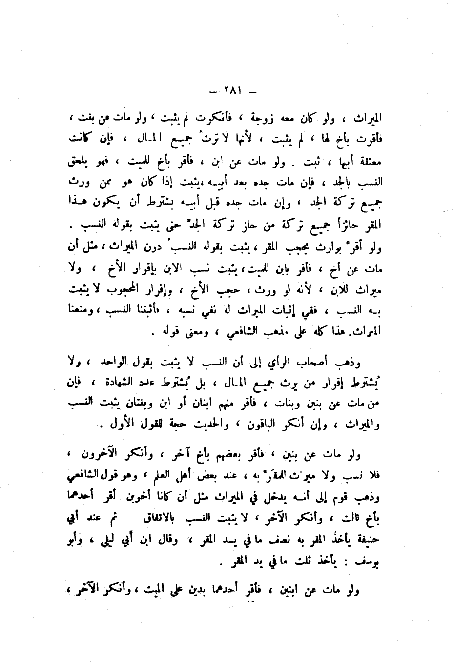 الْمِيرَاث، وَلَو كَانَ مَعَه زَوْجَة فأنكرت لم يثبت، وَلَو مَاتَ عَنْ بنت، فأقرت بِأَخ لَهَا، لم يثبت، لِأَنَّهَا لَا ترثُ جَمِيع المَال، فَإِن كَانَت مُعتقة أَبِيهَا، ثَبت، وَلَو مَاتَ عَنِ ابْن، فَأقر بِأَخ للْمَيت، هُوَ يلْحق النّسَب بالجد، فَإِن مَاتَ جده بعد أَبِيه، يثبت إِذا كَانَ هُوَ مِمَّن ورث جَمِيع تَرِكَة الْجد، وَإِن مَاتَ جده قبل أَبِيه يشْتَرط أَن يكون هَذَا حائزا جَمِيع تَرِكَة من حَاز تَرِكَة الجدِّ حَتَّى يثبت بقوله النّسَب، وَلَو أقرَّ بوارث يحجب الْمقر، يثبت بقوله النّسَب دون الْمِيرَاث، مثل أَن مَاتَ عَنْ أَخ، فَأقر بِابْن للْمَيت، يثبت نسب الابْن بِإِقْرَار الْأَخ، وَلَا مِيرَاث للِابْن، لِأَنَّهُ لَو ورث حجب الْأَخ، وَإِقْرَار المحجوب لَا يثبت بِهِ النّسَب، فَفِي إِثْبَات الْمِيرَاث لَهُ نفي نسبه، فأثبتنا النّسَب ومنعنا الْمِيرَاث، هَذَا كُله على مَذْهَب الشَّافِعِيّ، وَمعنى قَوْله.