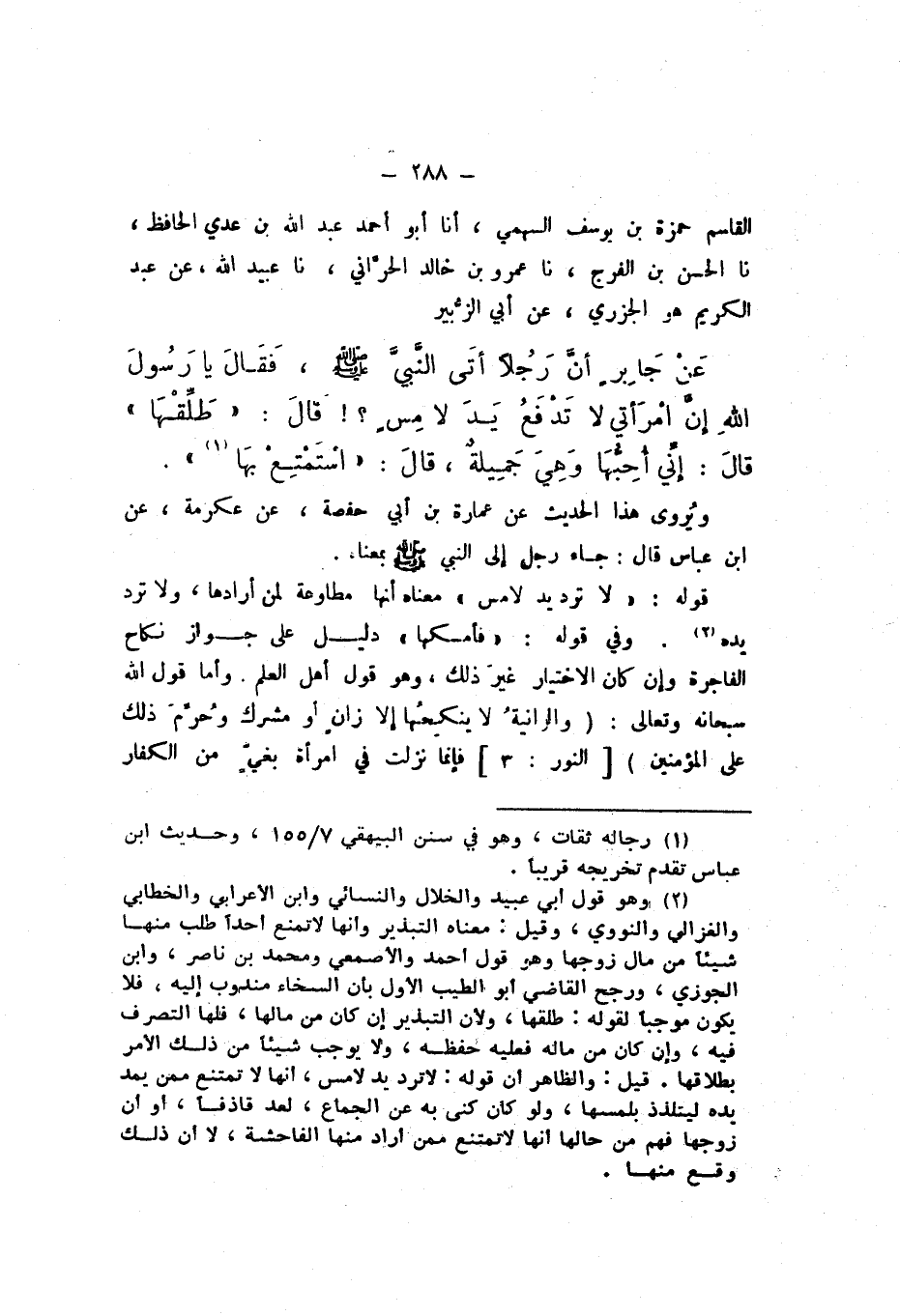 الْقَاسِمِ حَمْزَةُ بْنُ يُوسُفَ السَّهْمِيُّ، أَنا أَبُو أَحْمَدَ عَبْدُ اللَّهِ بْنُ عَدِيٍّ الْحَافِظُ، نَا الْحَسَنُ بْنُ الْفَرَجِ، نَا عَمْرُو بْنُ خَالِدٍ الْحَرَّانِيُّ، نَا عُبَيْدُ اللَّهِ، عَنْ عَبْدِ الْكَرِيمِ هُوَ الْجَزَرِيُّ، عَنْ أَبِي الزُّبَيْرِ، عَنْ جَابِرٍ، أَنَّ رَجُلا أَتَى النَّبِيَّ صَلَّى اللهُ عَلَيْهِ وَسَلَّمَ، فَقَالَ: يَا رَسُولَ اللَّهِ، إِنَّ امْرَأَتِي لَا تَدْفَعُ يَدَ لامِسٍ، قَالَ: «طَلِّقْهَا».