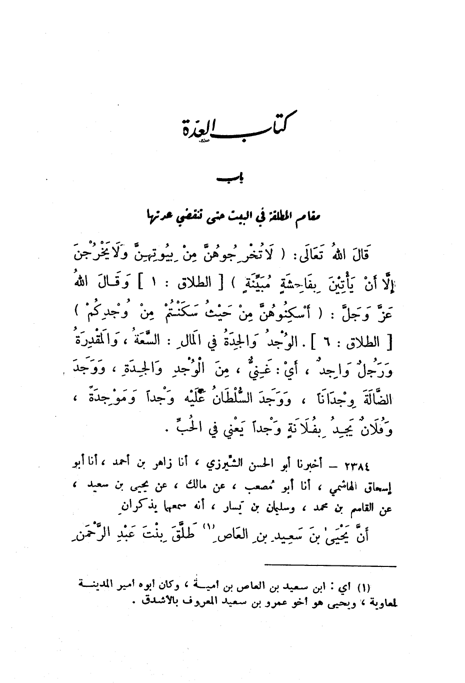 2384 - أَخْبَرَنَا أَبُو الْحَسَنِ الشِّيرَزِيُّ، أَنا زَاهِرُ بْنُ أَحْمَدَ، أَنا أَبُو إِسْحَاقَ الْهَاشِمِيُّ، أَنا أَبُو مُصْعَبٍ، عَنْ مَالِكٍ، عَنْ يَحْيَى بْنِ سَعِيدٍ، عَنِ الْقَاسِمِ بْنِ مُحَمَّدٍ، وَسُلَيْمَانَ بْنِ يَسَارٍ، أَنَّهُ سَمِعَهُمَا يَذْكُرَانِ: " أَنَّ يَحْيَى بْنَ سَعِيدِ بْنِ الْعَاصِ طَلَّقَ بِنْتَ عَبْدِ الرَّحْمَنِ