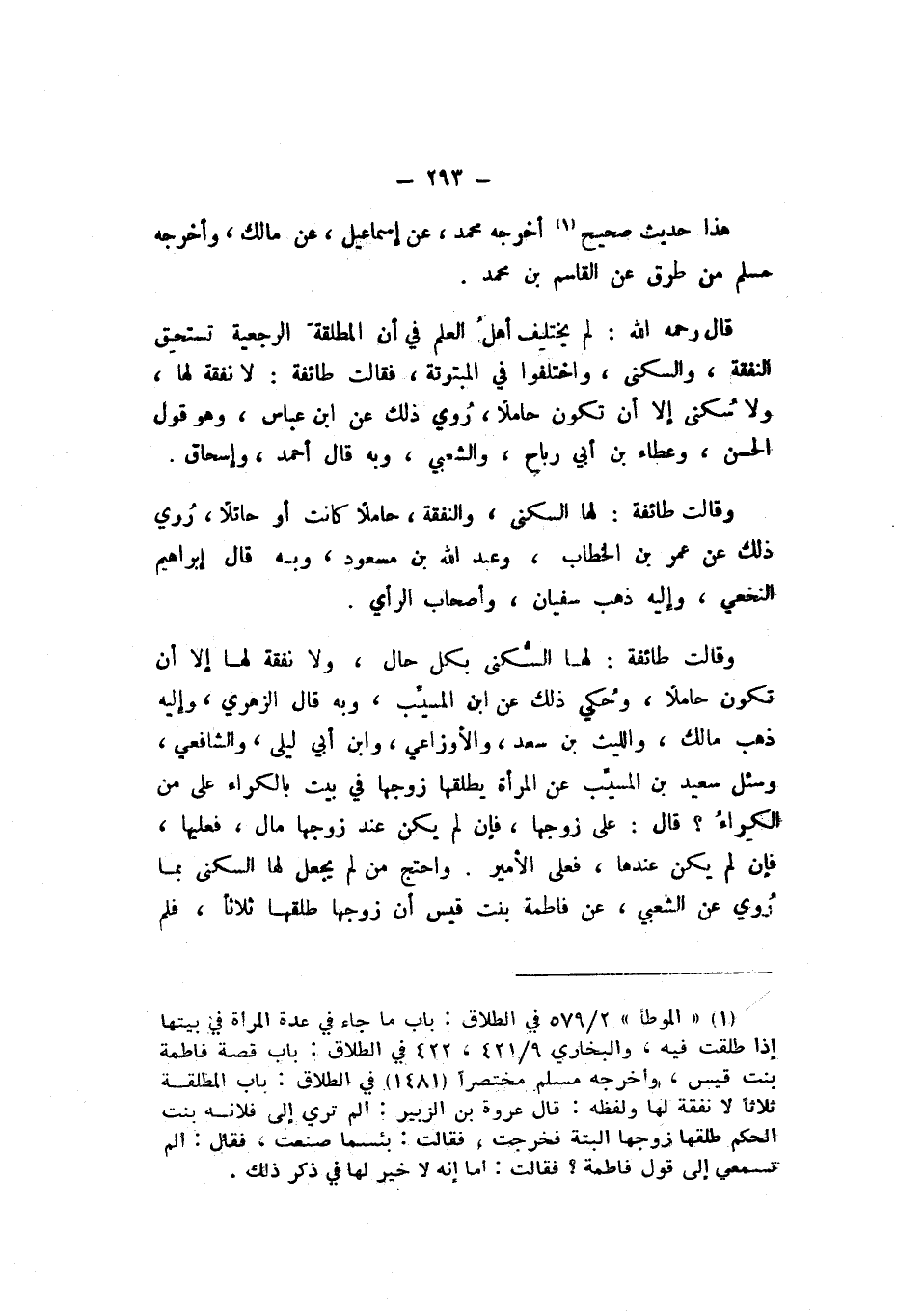 قَالَ رَحمَه اللَّه: لم يخْتَلف أهلُ الْعلم فِي أَن الْمُطلقَة الرَّجْعِيَّة تسْتَحقّ النَّفَقَة، وَالسُّكْنَى، وَاخْتلفُوا فِي المبتوتة، فَقَالَت طَائِفَة: لَا نَفَقَة لَهَا، وَلَا سُكنى إِلا أَن تكون حَامِلا، رُوي ذَلِكَ عَنِ ابْن عَبَّاس، وَهُوَ قَول الْحَسَن، وَعَطَاء بْن أَبِي رَبَاح، وَالشَّعْبِيّ، وَبِهِ قَالَ أَحْمَد، وَإِسْحَاق.