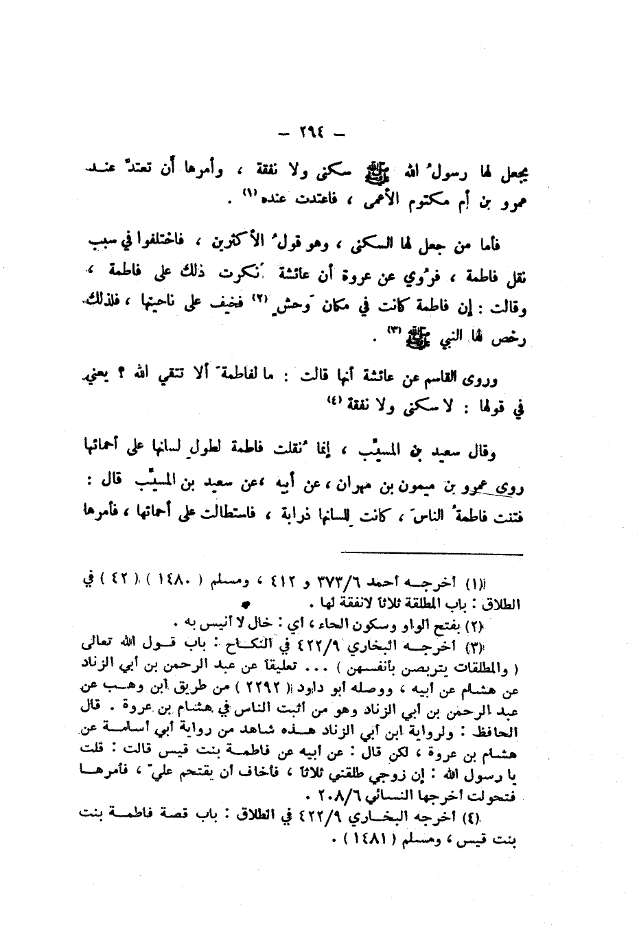 فَأَما من جعل لَهَا السُّكْنَى، وَهُوَ قولُ الْأَكْثَرين، فَاخْتَلَفُوا فِي سَبَب نقل فَاطِمَة، فرُوي عَنْ عُرْوَة، أَن عَائِشَة أنْكرت ذَلِكَ على فَاطِمَة، وَقَالَت: إنَّ فاطمةَ كَانَتْ فِي مكانٍ وَحْشٍ، فَخِيفَ على نَاحيتها، فلذَلِكَ رَخَّصَ لَهَا النَّبِيّ صَلَّى اللهُ عَلَيْهِ وَسَلَّمَ.