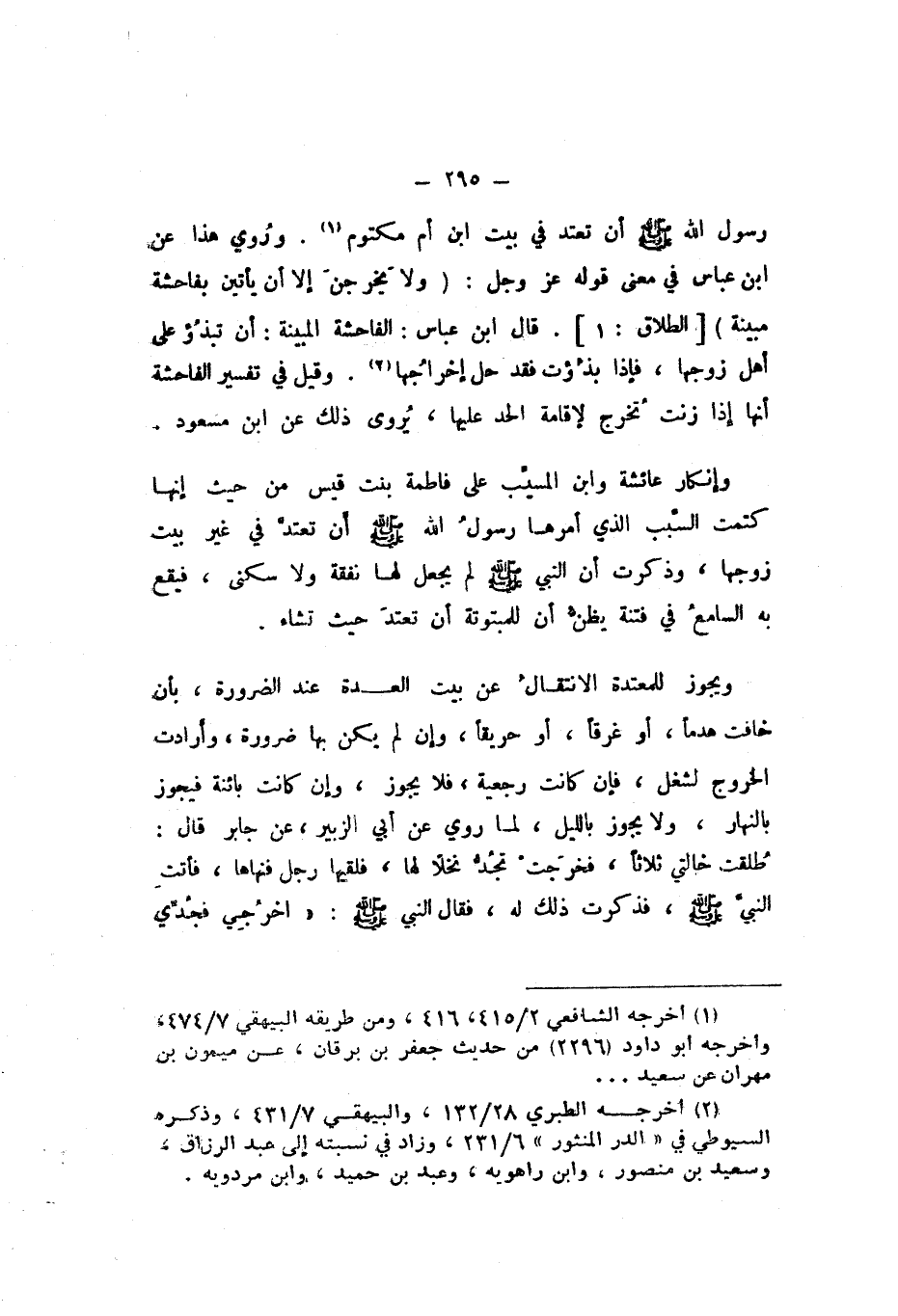 رَسُولُ اللَّه صَلَّى اللهُ عَلَيْهِ وَسَلَّمَ أَنْ تَعَتَدَّ فِي بيتِ ابْن أُمِّ مَكْتُومٍ، ورُوي هَذَا عَنِ ابْن عَبَّاس فِي معنى قَوْله عز وَجل: {وَلا يَخْرُجْنَ إِلا أَنْ يَأْتِينَ بِفَاحِشَةٍ مُبَيِّنَةٍ} [الطَّلَاق: 1].
