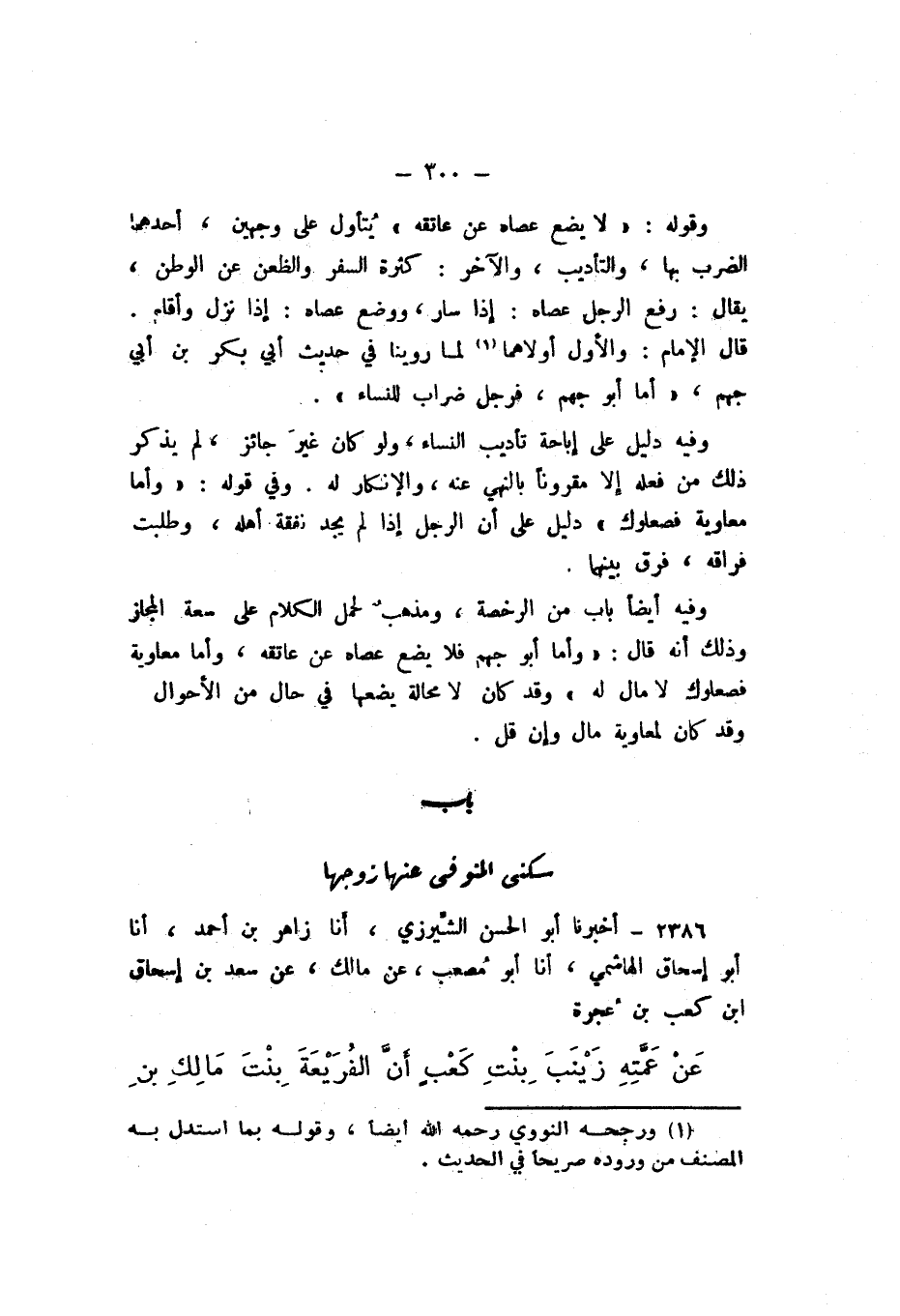 2386 - أَخْبَرَنَا أَبُو الْحَسَنِ الشِّيرَزِيُّ، أَنا زَاهِرُ بْنُ أَحْمَدَ، أَنا أَبُو إِسْحَاقَ الْهَاشِمِيُّ، أَنا أَبُو مُصْعَبٍ، عَنْ مَالِكٍ، عَنْ سَعْدِ بْنِ إِسْحَاقَ بْنِ كَعْبِ بْنِ عُجْرَةَ، عَنْ عَمَّتِهِ زَيْنَبَ بِنْتِ كَعْبٍ، أَنَّ الْفُرَيْعَةَ بِنْتَ مَالِكِ بْنِ