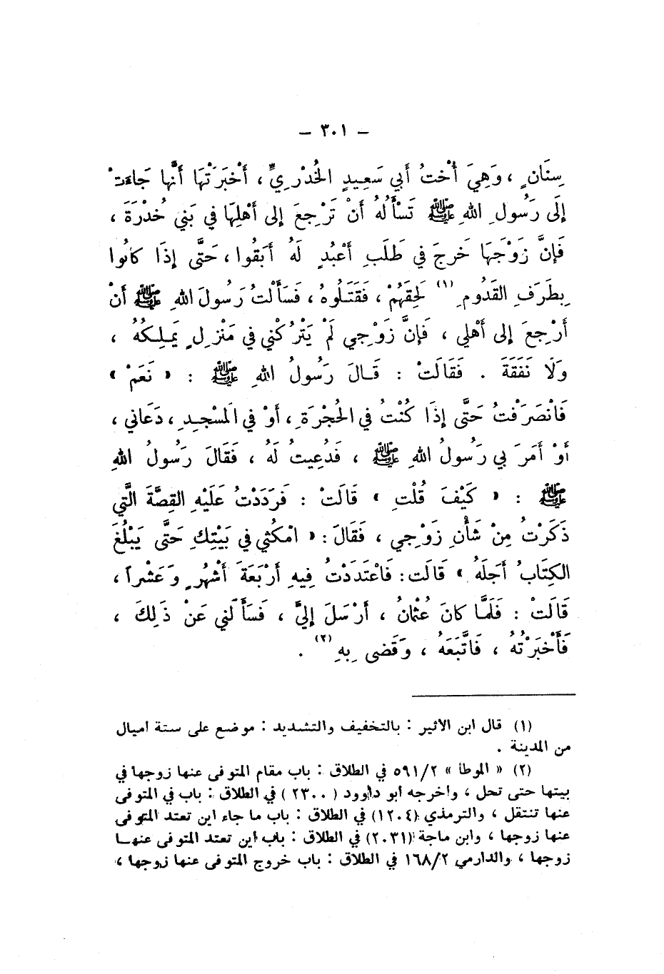 سِنَانٍ وَهِيَ أُخْتُ أَبِي سَعِيدٍ الْخُدْرِيِّ، أَخْبَرَتْهَا أَنَّهَا جَاءَتْ إِلَى رَسُولِ اللَّهِ صَلَّى اللهُ عَلَيْهِ وَسَلَّمَ تَسْأَلُهُ أَنْ تَرْجِعَ إِلَى أَهْلِهَا فِي بَنِي خُدْرَةَ، فَإِنَّ زَوْجَهَا خَرَجَ فِي طَلَبِ أَعْبُدٍ لَهُ أَبَقُوا، حتَّى إِذَا كَانُوا بِطَرَفِ الْقَدُومِ لَحِقَهُمْ، فَقَتَلُوهُ، فَسَأَلْتُ رَسُولَ اللَّهِ صَلَّى اللهُ عَلَيْهِ وَسَلَّمَ أَنْ أَرْجِعَ إِلَى أَهْلِي، فَإِنَّ زَوْجي لَمْ يَتْرُكْنِي فِي مَنْزِلٍ يَمْلِكُهُ، وَلا نَفَقَةٍ.