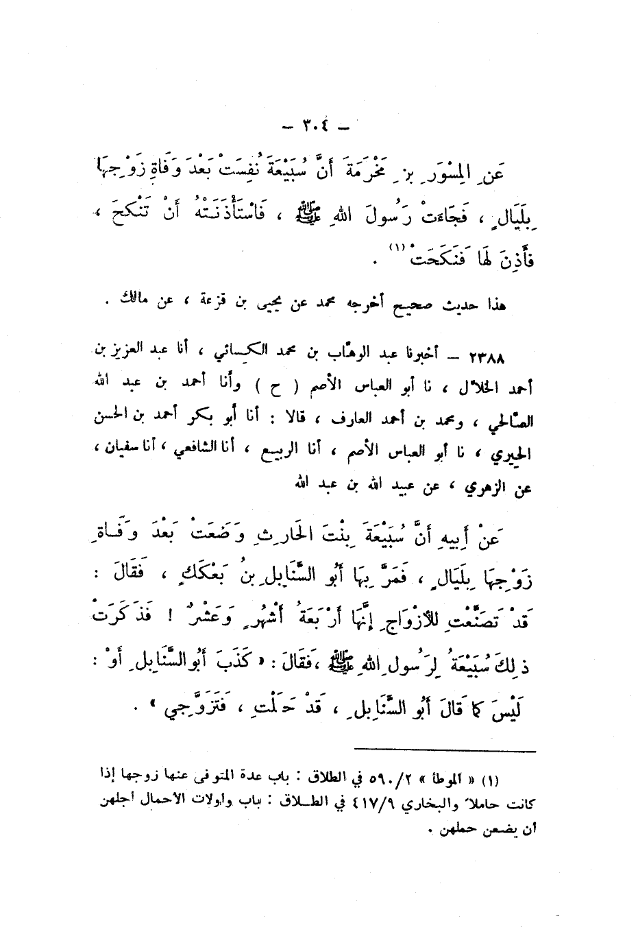 عَنِ الْمِسْوَرِ بْنِ مَخْرَمَةَ، «أَنَّ سُبَيْعَةَ نُفِسَتْ بَعْدَ وَفَاةِ زَوْجِهَا بِلَيَالٍ، فَجَاءَتْ رَسُولَ اللَّهِ صَلَّى اللهُ عَلَيْهِ وَسَلَّمَ، فاستأْذَنَتْهُ أَنْ تَنْكِحَ، فَأَذِنَ لَهَا فَنَكَحَتْ».
