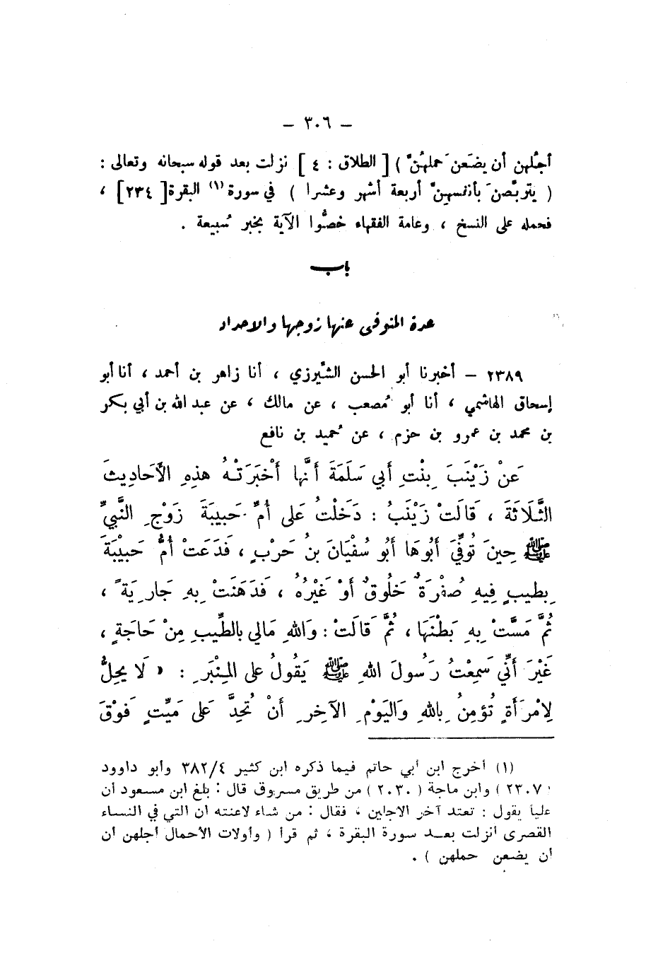 2389 - أَخْبَرَنَا أَبُو الْحَسَنِ الشِّيرَزِيُّ، أَنا زَاهِرُ بْنُ أَحْمَدَ، أَنا أَبُو إِسْحَاقَ الْهَاشِمِيُّ، أَنا أَبُو مُصْعَبٍ، عَنْ مَالِكٍ، عَنْ عَبْدِ اللَّهِ بْنِ أَبِي بَكْرِ بْنِ مُحَمَّدِ بْنِ عَمْرِو بْنِ حَزْمٍ، عَنْ حُمَيْدِ بْنِ نَافِعٍ، عَنْ زَيْنَبَ بِنْتِ أَبِي سَلَمَةَ، أَنَّهَا أَخْبَرَتْهُ هَذِهِ الأَحَادِيثَ الثَّلاثَةَ، قَالَتْ زَيْنَبُ: دَخَلْتُ عَلَى أُمِّ حَبِيبَةَ، زَوْجِ النَّبِيِّ صَلَّى اللهُ عَلَيْهِ وَسَلَّمَ حِينَ تُوُفِّيَ أَبُوهَا أَبُو سُفْيَانَ بْنُ حَرْبٍ، فَدَعَتْ أُمُّ حَبِيبَةَ بِطِيبٍ فِيهِ صُفْرَةٌ خَلُوقٌ أَوْ غَيْرُهُ، فَدَهَنَتْ بِهِ جَارِيَةً، ثُمَّ مَسَّتْ بِهِ بَطْنَهَا، ثُمَّ قَالَت: وَاللَّهِ مَا لِي بِالطِّيبِ مِنْ حَاجَةٍ، غَيْرَ أَنِّي سَمِعْتُ رَسُولَ اللَّهِ صَلَّى اللهُ عَلَيْهِ وَسَلَّمَ يَقُولُ عَلَى الْمِنْبَرِ: «لَا يَحِلُّ لامْرَأَةٍ تُؤمِنُ بِاللَّهِ وَالْيَوْمِ الآخِرِ أَنْ تُحِدَّ عَلَى مَيِّتٍ فَوْقَ