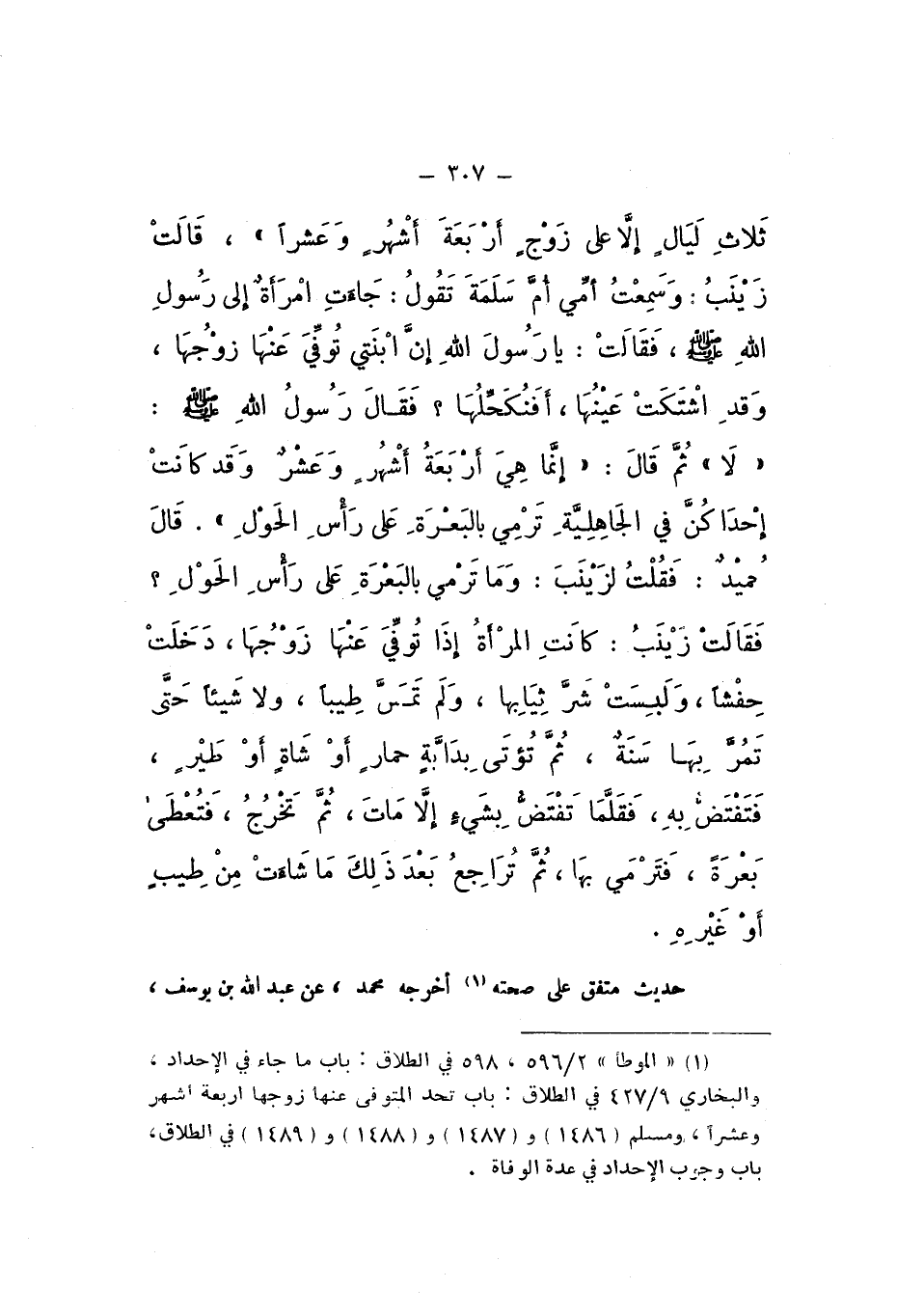 2389 - قَالَتْ زَينبُ: وَسَمِعْتُ أَمِّي أُمَّ سَلَمَةَ، تَقُولُ: جَاءَتِ امْرَأَةٌ إِلَى رَسُولِ اللَّهِ صَلَّى اللهُ عَلَيْهِ وَسَلَّمَ، فَقَالَتْ: يَا رَسُولَ اللَّهِ، إِنَّ ابْنَتِي تُوُفِّيَ عَنْهَا زَوْجُهَا، وَقَدِ اشْتَكَتْ عَيْنُهَا، أَفَنُكَحِّلُهَا؟، فَقَالَ رَسُولُ اللَّهِ صَلَّى اللهُ عَلَيْهِ وَسَلَّمَ: «لَا»، ثُمَّ قَالَ: «إِنَّمَا هِيَ أَرْبَعَةُ أَشْهُرٍ وَعَشْرٌ، وَقَدْ كَانَتْ إِحْدَاكُنَّ فِي الْجَاهِلِيَّةِ تَرْمِي بِالبَعْرَةِ عَلَى رَأْسِ الْحَوْلِ».