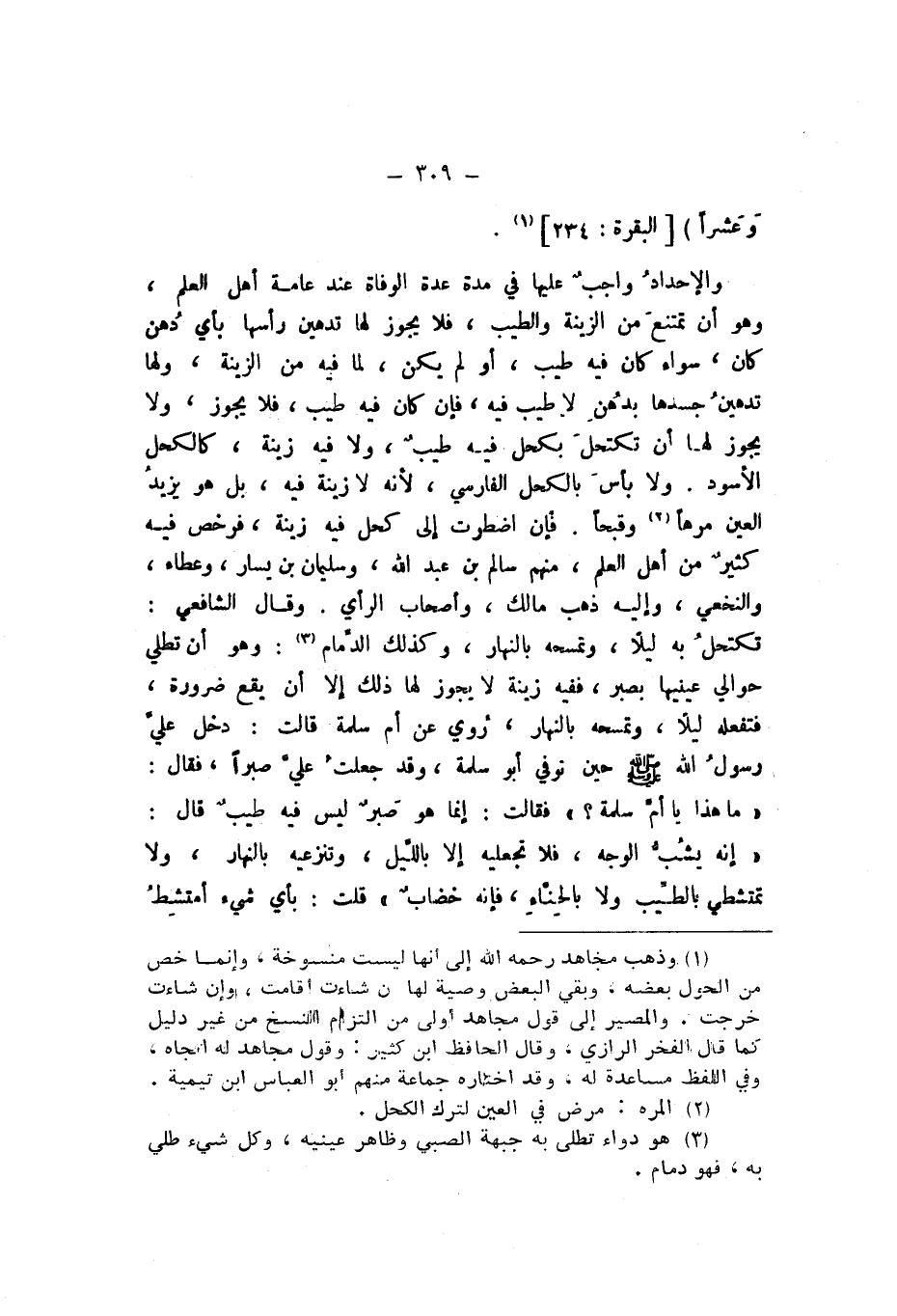 فَإِن اضطرت إِلَى كحل فِيهِ زِينَة، فَرخص فِيهِ كثيرٌ من أهل الْعلم، مِنْهُم سَالم بْن عَبْد اللَّهِ، وَسليمَان بْن يَسَار، وَعَطَاء، وَالنَّخَعِيّ، وَإِلَيْهِ ذهب مَالِك، وَأَصْحَاب الرَّأْي، وَقَالَ الشَّافِعِيّ: تكتحلُ بِهِ لَيْلًا، وتمسحه بِالنَّهَارِ، وَكَذَلِكَ الدِّمام: وَهُوَ أَن تطلي حوالي عينيها بصبر، فَفِيهِ زِينَة، لَا يجوز لَهَا ذَلِكَ إِلا أَن يَقع ضَرُورَة، فتفعله لَيْلًا، وتمسحه بِالنَّهَارِ، رُوي عَنْ أم سَلمَة، قَالَت: دخل عليَّ رَسُولُ اللَّه صَلَّى اللهُ عَلَيْهِ وَسَلَّمَ حِين توفّي أَبُو سَلمَة، وَقد جعلتُ عليَّ صبرا، فَقَالَ: «مَا هَذَا يَا أُمَّ سَلمَة؟»، فَقَالَت: إِنَّمَا هُوَ صبرٌ لَيْسَ فِيهِ طيب، قَالَ: «إِنَّهُ يَشُبُّ الْوَجْه، فَلَا تَجْعَليه إِلا باللَّيْلِ، وَتَنْزِعيه بالنَّهار، وَلَا تَمَتَشطي بالطِّيب، وَلَا بالْحِنَّاءِ، فَإِنَّهُ خِضَابٌ»، قلت: بِأَيّ شَيْء أمتِشطُ