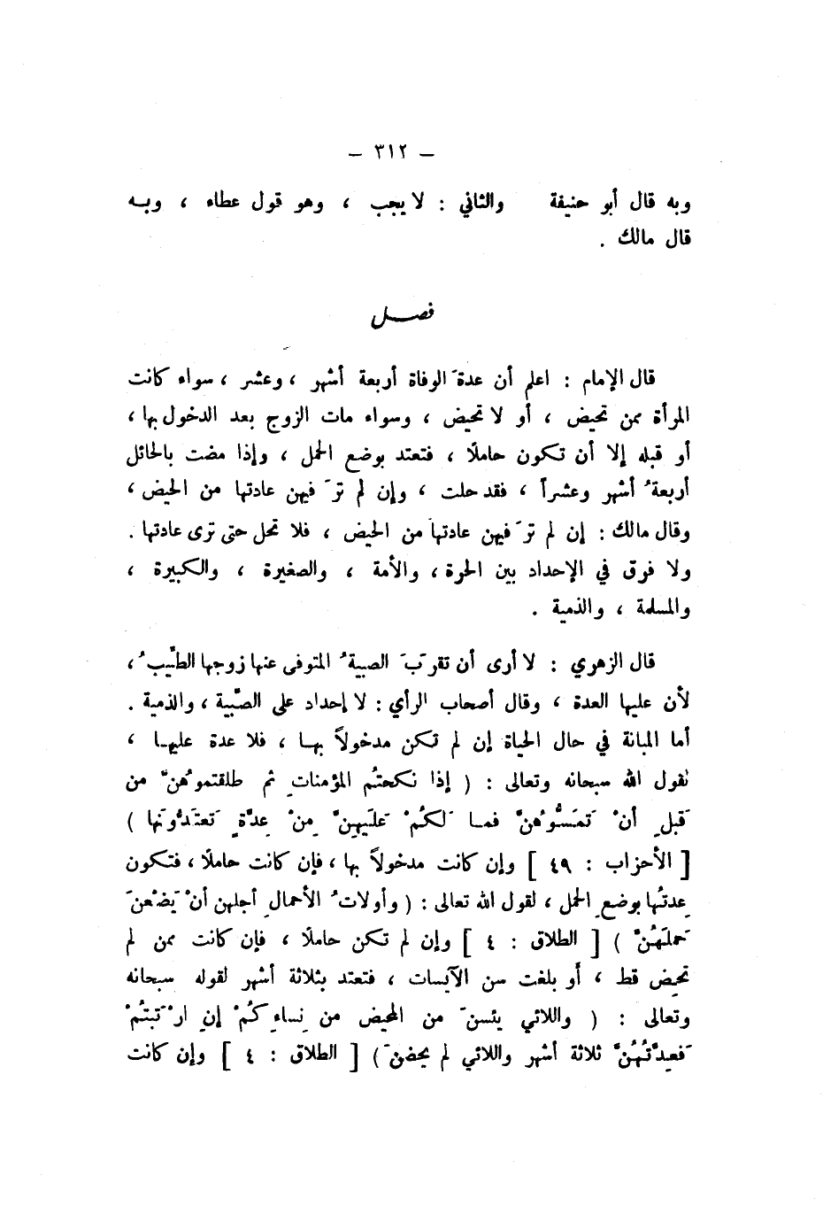 قَالَ الإِمَامُ: اعْلَم أَن عدَّة الْوَفَاة أَرْبَعَة أشهر وَعشر، سَوَاء كَانَت الْمَرْأَة مِمَّن تحيض، أَو لَا تحيض، وَسَوَاء مَاتَ الزَّوْج بعد الدُّخُول بهَا أَو قبله، إِلا أَن تكون حَامِلا، فَتعْتَد بِوَضْع الْحمل، وَإِذا مَضَت بالحائل أربعةُ أشهر وَعشرا، فقد حلت، وَإِن لم ترَ فِيهِنَّ عَادَتهَا من الْحيض، وَقَالَ مَالِك: إِن لم تَرَ فِيهِنَّ عَادَتهَا من الْحيض، فَلَا تحل حَتَّى ترى عَادَتهَا، وَلَا فرق فِي الْإِحْدَاد بَين الْحرَّة، وَالْأمة، وَالصَّغِيرَة، والكبيرة، والمسلمة، والذمية.