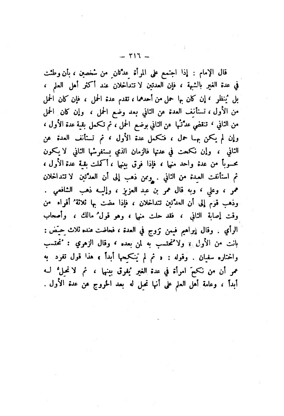 قَالَ الإِمَامُ: إِذا اجْتمع على الْمَرْأَة عدَّتانِ من شَخْصَيْنِ، بِأَن وطِئت فِي عدَّة الْغَيْر بِالشُّبْهَةِ، فَإِن العدتين لَا تتداخلان عِنْد أَكثر أهل الْعلم، بل يُنظر، إِن كَانَ بهَا حمل من أَحدهمَا، تقدم عدَّة الْحمل، فَإِن كَانَ الْحمل من الأول، تستأنِف الْعدة عَنِ الثَّانِي بعد وضع الْحمل، وَإِن كَانَ الْحمل من الثَّانِي، تَنْقَضِي عدَّتُها عَنِ الثَّانِي بِوَضْع الْحمل، ثُمَّ تكمل بَقِيَّة عدَّة الأول، وَإِن لم يكن بهَا حمل، فتكمل عدَّة الأول، ثُمَّ تسْتَأْنف الْعدة عَنِ الثَّانِي، وَإِن نكحت فِي عدتهَا، فالزمان الَّذِي يستفرشها الثَّانِي لَا يكون محسوبًا من عدَّة وَاحِد مِنْهُمَا، فَإِذا فرق بَينهمَا، أكملت بَقِيَّة عدَّة الأول، ثُمَّ استأنفت الْعدة من الثَّانِي.