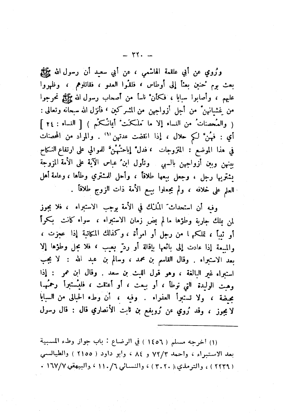 وَالْمرَاد من الْمُحْصنَات فِي هَذَا الْموضع: المتزوجات، فدلَّ إباحتُهُنَّ للموالي على ارْتِفَاع النِّكَاح بَينهُنَّ، وَبَين أَزوَاجهنَّ بِالسَّبْيِ، وَتَأَول ابْن عَبَّاس الْآيَة على الْأمة الْمُزَوجَة يَشْتَرِيهَا رجل، وَجعل بيعهَا طَلَاقا، وَأحل للْمُشْتَرِي وَطأهَا، وَعَامة أهل الْعلم على خِلَافه، وَلم يجْعَلُوا بيع الْأمة ذَات الزَّوْج طَلَاقا.