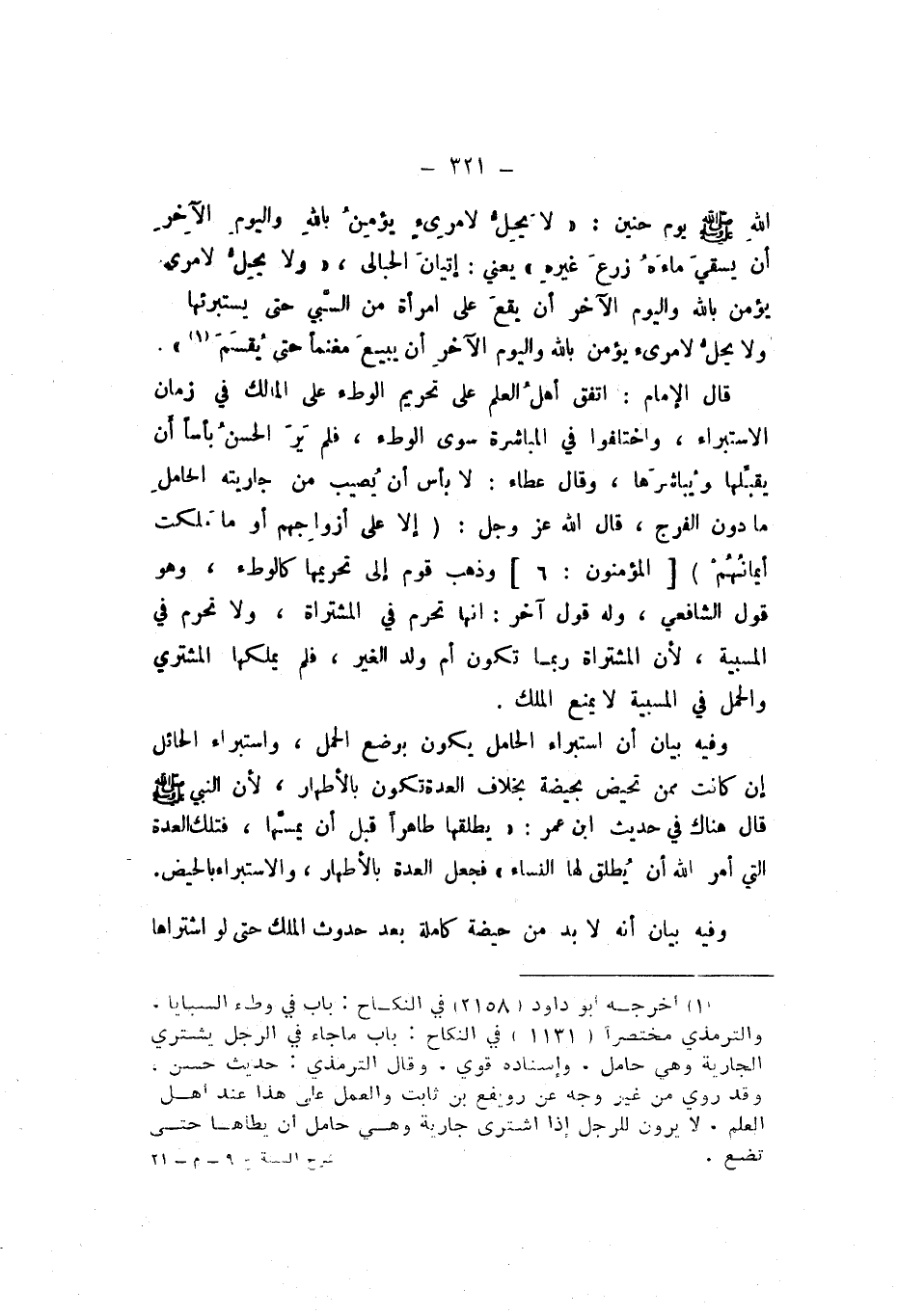 يَعْنِي: إتْيَان الحبالى، «وَلَا يَحِلُّ لامرئ يُؤْمِنُ بِاللَّه واليَوْمِ الآخِرِ أَنْ يَقَعَ عَلَى امْرَأَةٍ مِنَ السَّبي حتَّى يَسْتَبْرِئَهَا، وَلا يَحِلُّ لامرئ يُؤْمِنُ بِاللَّه واليَوْمِ الآخِرِ أَنْ يَبِيعَ مَغْنَمًا حَتَّى يُقْسِمِ».