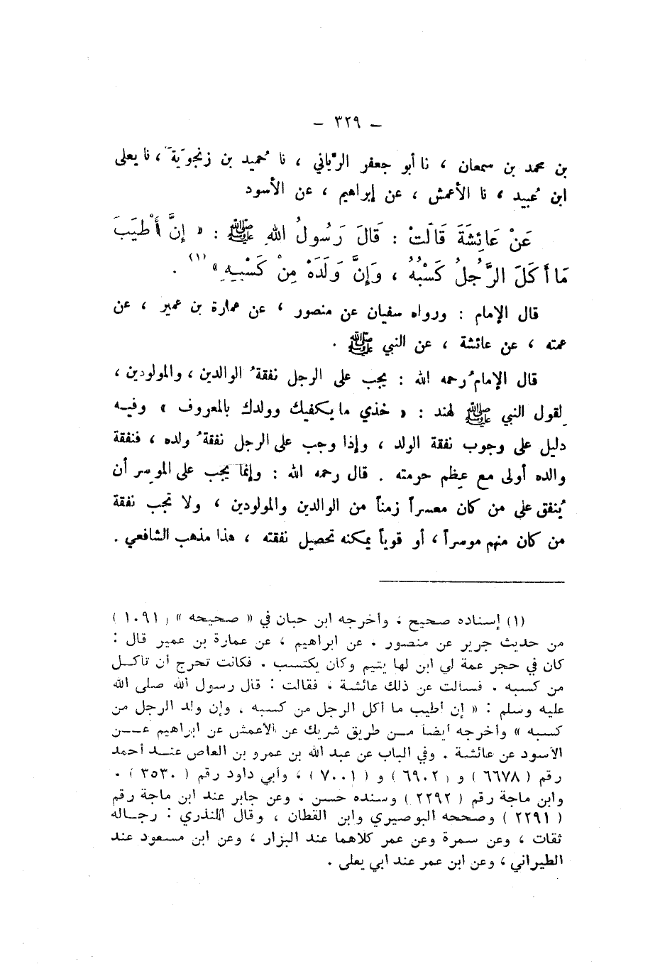 بْنُ مُحَمَّدِ بْنِ سَمْعَانَ، نَا أَبُو جَعْفَرٍ الرَّيَّانِيُّ، نَا حُمَيْدُ بْنُ زَنْجُوَيْهِ، نَا يَعْلَى بْنُ عُبَيْدٍ، نَا الأَعْمَشُ، عَنْ إِبْرَاهِيمَ، عَنِ الأَسْوَدِ، عَنْ عَائِشَةَ، قَالَتْ: قَالَ رَسُولُ اللَّهِ صَلَّى اللهُ عَلَيْهِ وَسَلَّمَ: «إِنَّ أَطْيَبَ مَا أَكَلَ الرَّجُلُ كَسْبُهُ، وَإِنَّ وَلَدَهُ مِنْ كَسْبِهِ»