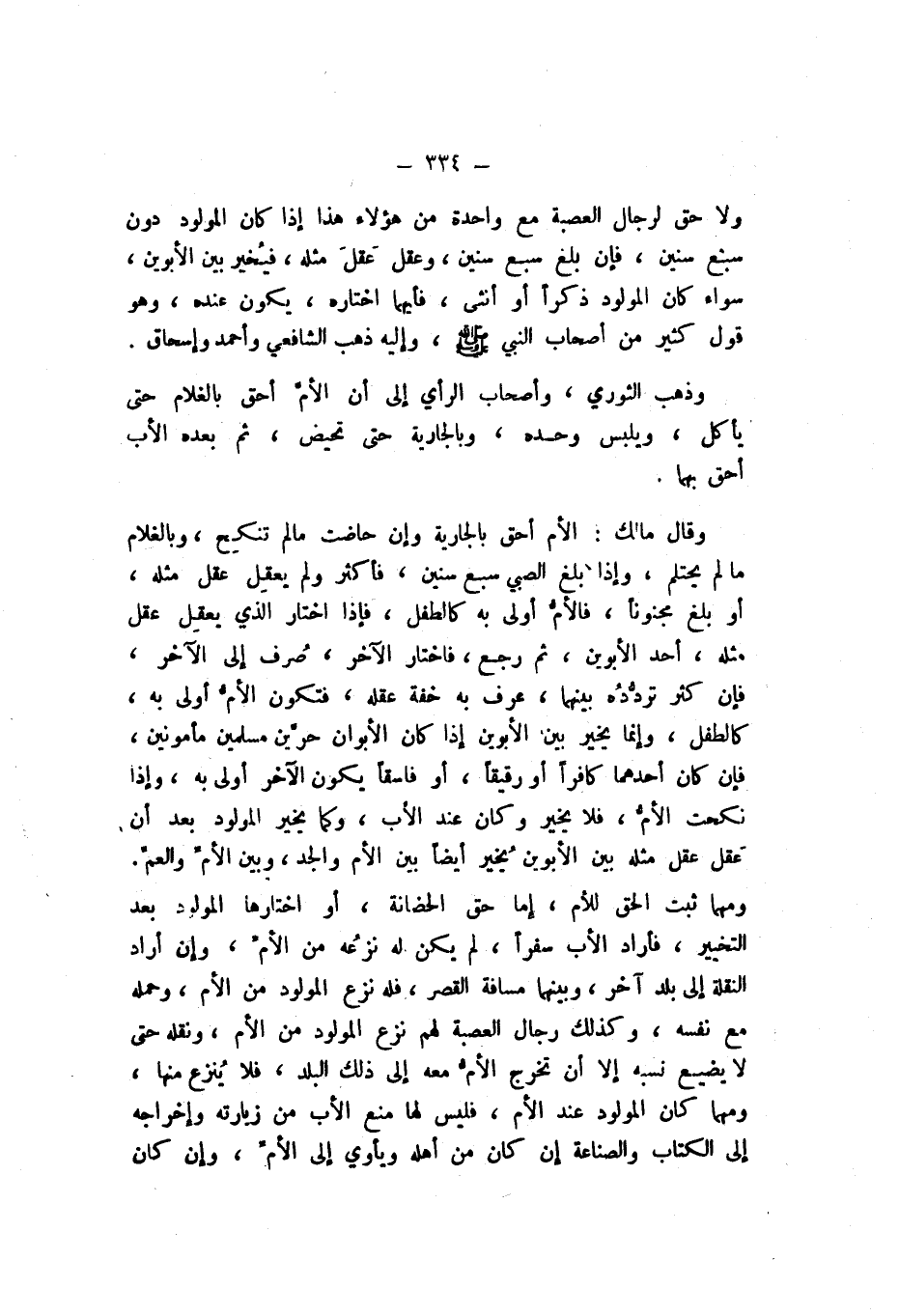 وَلَا حق لرجال الْعصبَة مَعَ وَاحِدَة من هَؤُلَاءِ، هَذَا إِذا كَانَ الْمَوْلُود دون سبع سِنِين، فَإِن بلغ سبع سِنِين، وعقل عَقل مثله، فيُخير بَين الْأَبَوَيْنِ، سَوَاء كَانَ الْمَوْلُود ذكرا أَو أُنْثَى، فَأَيّهمَا اخْتَارَهُ، يكون عِنْده، وَهُوَ قَول كثير من أَصْحَاب النَّبِيّ صَلَّى اللهُ عَلَيْهِ وَسَلَّمَ، وَإِلَيْهِ ذهب الشَّافِعِيّ، وَأَحْمَد، وَإِسْحَاق.