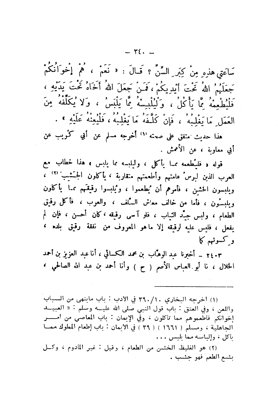قَوْله: «فَلْيُطْعِمَهُ مِمَّا يَأْكُلْ، وَلْيُلْبِسَهُ مِمَّا يَلْبَسُ» هَذَا خطاب مَعَ الْعَرَب الَّذين لبوسُ عامتهم، وأطعمتهم مُتَقَارِبَة، يَأْكُلُون الجَشِب، وَيلبسُونَ الخشن، فَأَمرهمْ أَن يُطعموا، ويُلبسوا رقيقَهم، مِمَّا يَأْكُلُون وَيلبسُونَ، فَأَما من خَالف معاش السَّلف، وَالْعرب، فَأكل رَقِيق الطَّعَام، وَلبس جيِّد الثِّيَاب، فَلَو آسى رَقِيقه، كَانَ أحسن، فَإِن لم يفعل، فَلَيْسَ عَلَيْهِ لرقيقه إِلا مَا هُوَ الْمَعْرُوف من نَفَقَة رقيقَة بَلَده، وكِسوتهم كَمَا.