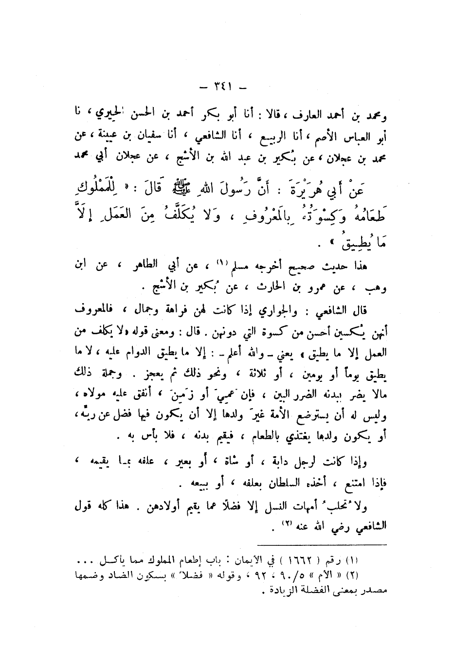 وَمُحَمَّدُ بْنُ أَحْمَدَ الْعَارِفُ، قَالا: أَنا أَبُو بَكْرٍ أَحْمَدُ بْنُ الْحَسَنِ الْحِيرِيُّ نَا أَبُو الْعَبَّاسِ الأَصَمُّ، أَنا الرَّبِيعُ، أَنا الشَّافِعِيُّ، أَنا سُفْيَانُ بْنُ عُيَيْنَةَ، عَنْ مُحَمَّدِ بْنِ عَجْلانَ، عَنْ بُكَيْرِ بْنِ عَبْدِ اللَّهِ بْنِ الأَشَجِّ، عَنْ عَجْلانَ أَبِي مُحَمَّدٍ، عَنْ أَبي هُرَيْرَةَ، أَنّ رَسُولَ اللَّهِ صَلَّى اللهُ عَلَيْهِ وَسَلَّمَ، قَالَ: «لِلْمَمْلُوكِ طَعَامُهُ وكِسْوَتُهُ بالمَعْرَوفِ، وَلا يُكَلَّفُ مِنَ الْعَمَلِ إِلا مَا يُطِيقُ».