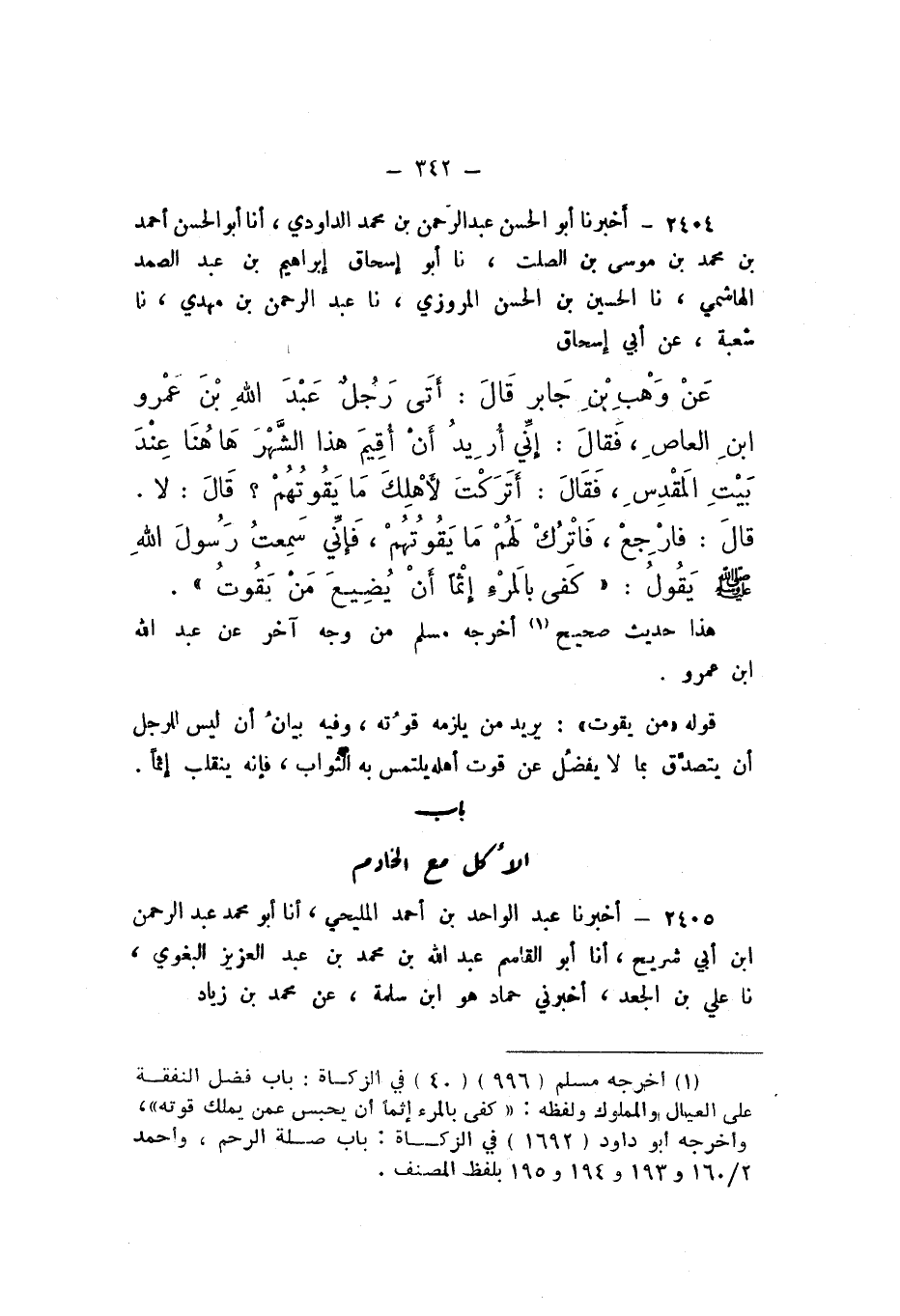 2404 - أَخْبَرَنَا أَبُو الْحَسَنِ عَبْدُ الرَّحْمَنِ بْنُ مُحَمَّدٍ الدَّاوُدِيُّ، أَنا أَبُو الْحَسَنِ أَحْمَدُ بْنُ مُحَمَّدِ بْنِ مُوسَى بْنِ الصَّلْتِ، نَا أَبُو إِسْحَاقَ إِبْرَاهِيمُ بْنُ عَبْدِ الصَّمَدِ الْهَاشِمِيُّ، نَا الْحُسَيْنُ بْنُ الْحَسَنِ الْمَرْوَزِيُّ، نَا عَبْدُ الرَّحْمَنِ بْنُ مَهْدِيٍّ، نَا شُعْبَةُ، عَنْ أَبِي إِسْحَاقَ، عَنْ وَهْبِ بْنِ جَابِرٍ، قَالَ: أَتَى رَجُلٌ عَبْدَ اللَّهِ بْنَ عَمْرِو بْنِ الْعَاصِ، فَقَالَ: إِنِّي أُرِيدُ أَنْ أُقِيمَ هَذَا الشَّهْرَ هَهُنَا عِنْدَ بَيْتِ الْمَقْدِسِ، فَقَالَ: أَتَرَكْتَ لأَهْلِكَ مَا يَقُوتُهُمْ؟ قَالَ: لَا.