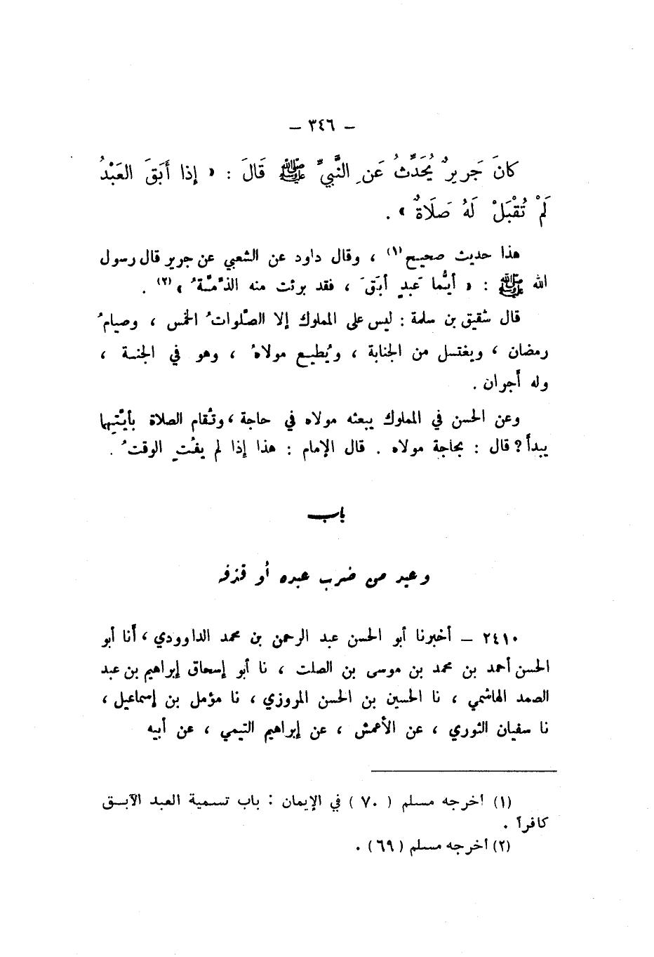 كَانَ جَرِيرٌ يُحَدِّثُ، عَنِ النَّبِيِّ صَلَّى اللهُ عَلَيْهِ وَسَلَّمَ، قَالَ: «إِذَا أَبَقَ العَبْدُ لَمْ تُقْبَلْ لَهُ صَلاةٌ».