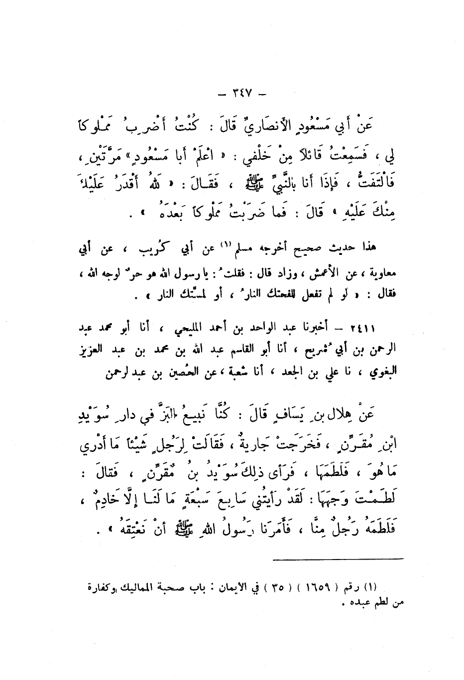 2411 - أَخْبَرَنَا عَبْدُ الْوَاحِدِ بْنُ أَحْمَدَ الْمَلِيحِيُّ، أَنا أَبُو مُحَمَّدٍ عَبْدُ الرَّحْمَنِ بْنُ أَبِي شُرَيْحٍ، أَنا أَبُو الْقَاسِمِ عَبْدُ اللَّهِ بْنُ مُحَمَّدِ بْنِ عَبْدِ الْعَزِيزِ الْبَغَوِيُّ، نَا عَلِيُّ بْنُ الْجَعْدِ، أَنا شُعْبَةُ، عَنِ الْحُصَيْنِ بْنِ عَبْدِ الرَّحْمَنِ، عَنْ هِلالِ بْنِ يَسَافٍ، قَالَ: كُنَّا نَبِيعُ الْبَزَّ فِي دَارِ سُوَيْدِ بْنِ مُقَرِّنٍ، فَخَرَجَتْ جَارِيَةٌ، فَقَالَتْ لِرَجُلٍ شَيْئًا مَا أَدْرِي مَا هُوَ، فَلَطَمَهَا، فَرَأَى ذَلِكَ سُوَيْدُ بْنُ مُقَرِّنٍ، فَقَالَ: «لَطَمْتَ وَجْهَهَا، لَقَدْ رَأَيْتُنِي سَابِعَ سَبْعَةٍ مَا لَنَا إِلا خَادِمٌ، فَلَطَمَهُ رَجُلٌ مِنَّا، فَأَمَرَنَا رَسُولُ اللَّهِ صَلَّى اللهُ عَلَيْهِ وَسَلَّمَ أَنْ نَعْتِقَهُ».