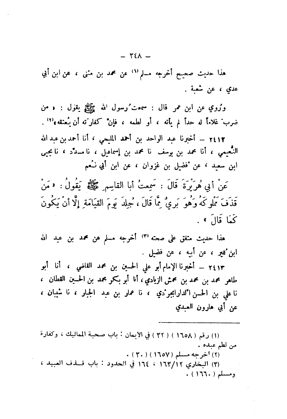 2412 - أَخْبَرَنَا عَبْدُ الْوَاحِدِ بْنُ أَحْمَدَ الْمَلِيحِيُّ، أَنا أَحْمَدُ بْنُ عَبْدِ اللَّهِ النُّعَيْمِيُّ، أَنا مُحَمَّدُ بْنُ يُوسُفَ، نَا مُحَمَّدُ بْنُ إِسْمَاعِيلَ، نَا مُسَدَّدٌ، نَا يَحْيَى بْنُ سَعِيدٍ، عَنْ فُضَيْلِ بْنِ غَزْوَانَ، عَنِ ابْنِ أَبِي نُعْمٍ، عَنْ أَبي هُرَيْرَةَ، قَالَ: سَمِعْتُ أَبَا الْقَاسِمِ صَلَّى اللهُ عَلَيْهِ وَسَلَّمَ، يَقُولُ: «مَنْ قَذَفَ مَمْلُوكَهُ وَهُوَ بَرِيءٌ مِمَّا قَالَ، جُلِدَ يَوْمَ الْقِيَامَةِ إِلا أَنْ يَكُونَ كَمَا قَالَ».
