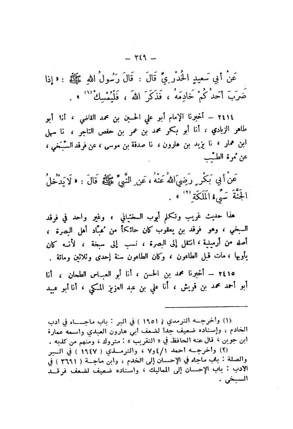 2414 - أَخْبَرَنَا الإِمَامُ أَبُو عَلِيٍّ الْحُسَيْنُ بْنُ مُحَمَّدٍ الْقَاضِي، أَنا أَبُو طَاهِرٍ الزِّيَادِيُّ، أَنا أَبُو بَكْرٍ مُحَمَّدُ بْنُ عُمَرَ بْنِ حَفْصٍ التَّاجِرُ، نَا سَهْلُ بْنُ عَمَّارٍ، نَا يَزِيدُ بْنُ هَارُونَ، نَا صَدَقَةُ بْنُ مُوسَى، عَنْ فَرْقَدٍ السَّبَخِيِّ، عَنْ مُرَّةَ الطَّيِّبِ، عَنْ أَبِي بَكْرٍ، رَضِيَ اللَّهُ عَنْهُ، عَنِ النَّبِيِّ صَلَّى اللهُ عَلَيْهِ وَسَلَّمَ، قَالَ: «لَا يَدْخُلُ الْجَنَّةَ سَيِّءُ الْمَلَكَةِ».