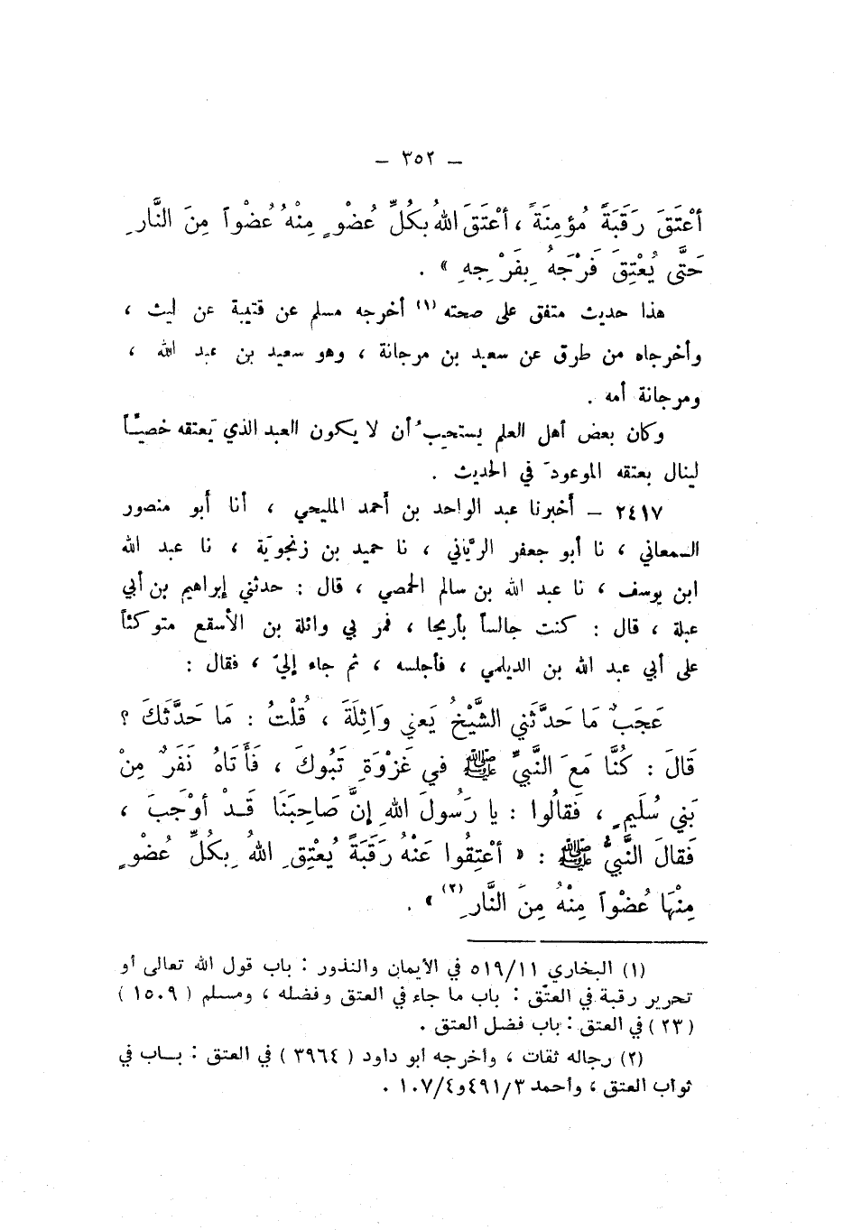 2417 - أَخْبَرَنَا عَبْدُ الْوَاحِدِ بْنُ أَحْمَدَ الْمَلِيحِيُّ، أَنا أَبُو مَنْصُورٍ السَّمْعَانِيُّ، نَا أَبُو جَعْفَرٍ الرَّيَّانِيُّ، نَا حُمَيْدُ بْنُ زَنْجوَيْهِ، نَا عَبْدُ اللَّهِ بْنُ يُوسُفَ، نَا عَبْدُ اللَّهِ بْنُ سَالِمٍ الْحِمْصِيُّ، قَالَ: حَدَّثَنِي إِبْرَاهِيمُ بْنُ أَبِي عَبْلَةَ، قَالَ: كُنْتُ جَالِسًا بِأَرِيحَا، فَمَرَّ بِي وَاثِلَةُ بْنُ الأَسْقَعِ مُتَوَكِّئًا عَلَى أَبِي عَبْدِ اللَّهِ بْنِ الدَّيْلَمِيِّ، فَأَجْلَسَهُ، ثُمَّ جَاءَ إِلَيَّ، فَقَالَ: عَجَبٌ مَا حَدَّثَنِي الشَّيْخُ يَعْنِي: وَاثِلَةَ، قُلْتُ: مَا حَدَّثَكَ؟ قَالَ: كُنَّا مَعَ النَّبِيِّ صَلَّى اللهُ عَلَيْهِ وَسَلَّمَ فِي غَزْوَةِ تَبُوكَ، فَأتَاهُ نَفَرٌ مِنْ بَنِي سُلَيْمٍ، فَقَالُوا: يَا رَسُولَ اللَّهِ، إِنَّ صَاحِبَنَا قَدْ أَوْجَبَ، فَقَالَ النَّبِيُّ صَلَّى اللهُ عَلَيْهِ وَسَلَّمَ: «أَعْتِقُوا عَنْهُ رَقَبَةً يُعْتِقِ اللَّهُ بِكُلِّ عُضْوٍ مِنْهَا عُضْوًا مِنْهُ مِنَ النَّارِ»