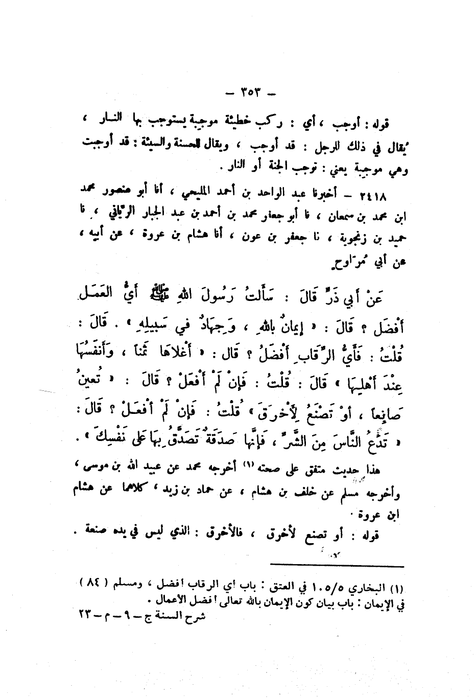 2418 - أَخْبَرَنَا عَبْدُ الْوَاحِدِ بْنُ أَحْمَدَ الْمَلِيحِيُّ، أَنا أَبُو مَنْصُورٍ مُحَمَّدُ بْنُ مُحَمَّدِ بْنِ سَمْعَانَ، نَا أَبُو جَعْفَرٍ مُحَمَّدُ بْنُ أَحْمَدَ بْنِ عَبْدِ الْجَبَّارِ الرَّيَّانِيُّ، نَا حُمَيْدُ بْنُ زَنْجُوَيْهِ، نَا جَعْفَرُ بْنُ عَوْنٍ، أَنا هِشَامُ بْنُ عُرْوَةَ، عَنْ أَبِيهِ، عَنْ أَبِي مُرَاوِحٍ، عَنْ أَبِي ذَرٍّ، قَالَ: سَأَلْتُ رَسُولَ اللَّهِ صَلَّى اللهُ عَلَيْهِ وَسَلَّمَ أَيُّ الْعَمَلِ أَفْضَلُ؟ قَالَ: «إِيمَانٌ بِاللَّهِ، وَجِهَادٌ فِي سَبِيلِهِ»، قَالَ: قُلْتُ: فَأَيُّ الرِّقَابِ أَفْضَلُ؟ قَالَ: «أَغْلاهَا ثَمَنًا، وَأَنْفَسُهَا عِنْدَ أَهْلِهَا»، قَالَ: قُلْتُ: فَإِنْ لَمْ أَفْعَلْ؟ قَالَ: «تُعِينُ صَانِعًا، أَوْ تَصْنَعُ لأَخْرَقَ»، قُلْتُ: فَإِنْ لَمْ أَفْعَلْ؟ قَالَ: «تَدَعُ النَّاسَ مِنَ الشَّرِّ، فَإِنَّهَا صَدَقَةٌ تَصَدَّقُ بِهَا عَلَى نَفْسِكَ».