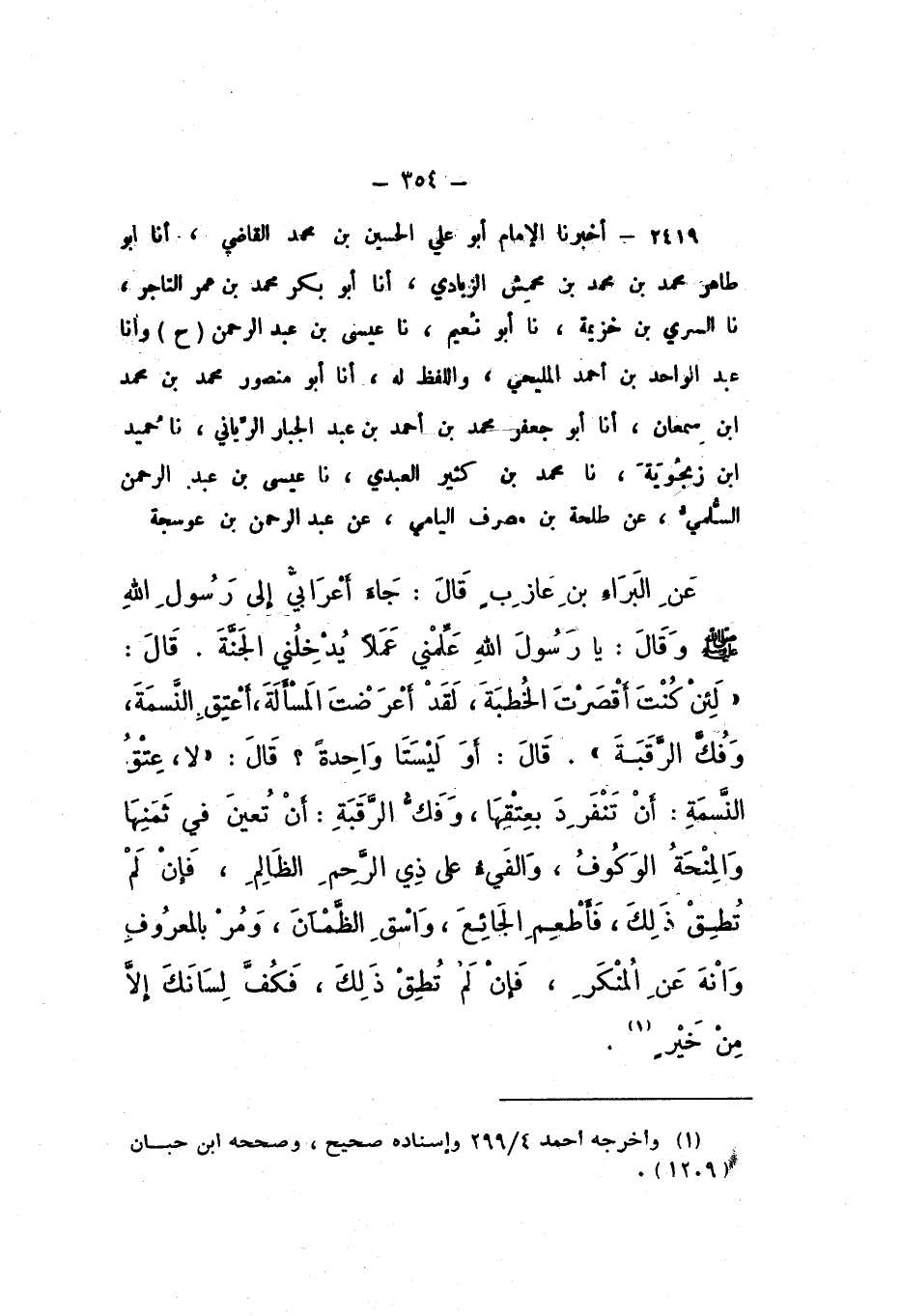 ح وَأَنا عَبْدُ الْوَاحِدِ بْنُ أَحْمَدَ الْمَلِيحِيُّ، وَاللَّفْظُ لَهُ، أَنا أَبُو مَنْصُورٍ مُحَمَّدُ بْنُ مُحَمَّدِ بْنِ سَمْعَانَ، أَنا أَبُو جَعْفَرٍ مُحَمَّدُ بْنُ أَحْمَدَ بْنِ عَبْدِ الْجَبَّارِ الرَّيَّانِيُّ، نَا حُمَيْدُ بْنُ زَنْجُوَيْهِ، نَا مُحَمَّدُ بْنُ كَثِيرٍ الْعَبْدِيُّ، نَا عِيسَى بْنُ عَبْدِ الرَّحْمَنِ السُّلَمِيُّ، عَنْ طَلْحَةَ بْنِ مُصَرِّفٍ الْيَامِيِّ، عَنْ عَبْدِ الرَّحْمَنِ بْنِ عَوْسَجَةَ، عَنِ الْبَرَاءِ بْنِ عَازِبٍ، قَالَ: جَاءَ أَعْرَابِيٌّ إِلَى رَسُولِ اللَّهِ صَلَّى اللهُ عَلَيْهِ وَسَلَّمَ، وَقَالَ: يَا رَسُولَ اللَّهِ، عَلِّمْنِي عَمَلا يُدْخِلُني الْجَنَّةَ.