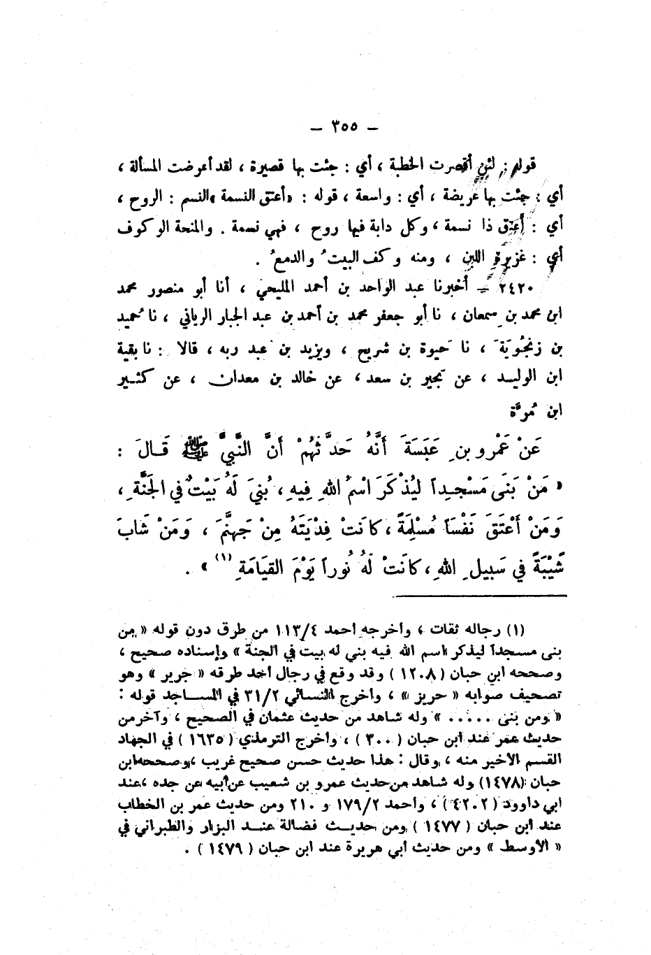 2420 - أَخْبَرَنَا عَبْدُ الْوَاحِدِ بْنُ أَحْمَدَ الْمَلِيحِيُّ، أَنا أَبُو مَنْصُورٍ مُحَمَّدُ بْنُ مُحَمَّدِ بْنِ سَمْعَانَ، نَا أَبُو جَعْفَرٍ مُحَمَّدُ بْنُ أَحْمَدَ بْنِ عَبْدِ الْجَبَّارِ الرَّيَّانِيُّ، نَا حُمَيْدُ بْنُ زَنْجُوَيْهِ، نَا حَيْوَةُ بْنُ شُرَيْحٍ، وَيَزِيدُ بْنُ عَبْدِ رَبِّهِ، قَالا: نَا بَقِيَّةُ بْنُ الْوَلِيدِ، عَنْ بَحِيرِ بْنِ سَعْدٍ، عَنْ خَالِدِ بْنِ مَعْدَانَ، عَنْ كَثِيرِ بْنِ مُرَّةَ، عَنْ عَمْرِو بْنِ عَبَسَةَ، أَنَّهُ حَدَّثَهُمْ أَنَّ النَّبِيَّ صَلَّى اللهُ عَلَيْهِ وَسَلَّمَ، قَالَ: «مَنْ بَنَى مَسْجِدًا لِيُذْكَرَ اسْمُ اللَّهِ فِيهِ، بُنِيَ لَهُ بَيْتٌ فِي الْجَنَّةِ، وَمَنْ أَعْتَقَ نَفْسًا مُسْلِمَةً، كَانَتْ فِدْيَتَهُ مِنْ جَهَنَّمَ، وَمَنْ شَابَ شَيْبَةً فِي سَبِيلِ اللَّهِ، كَانَتْ لَهُ نُورًا يَوْمَ الْقِيَامَةِ».