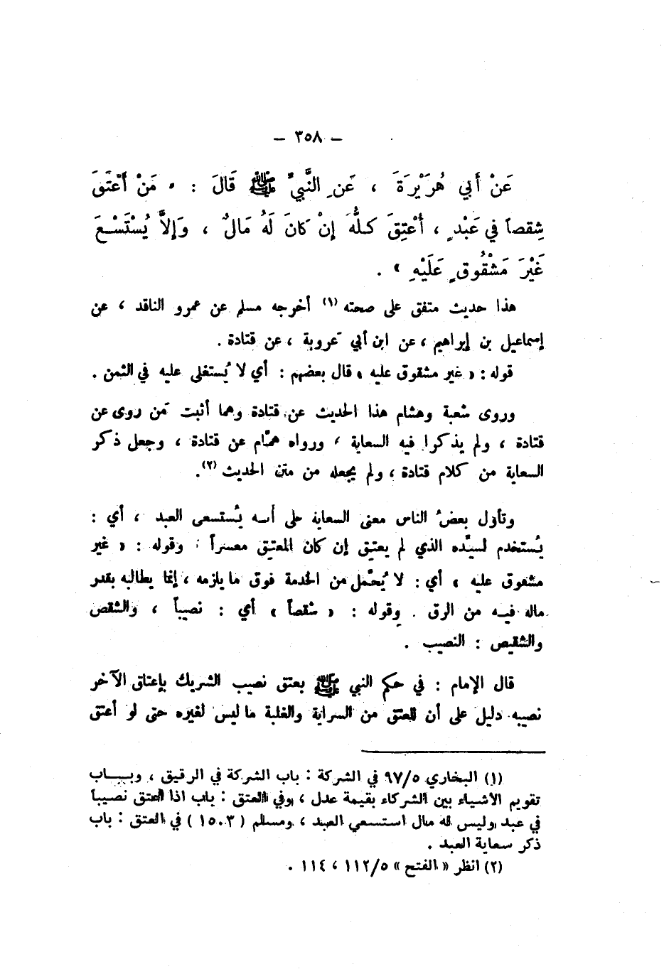 عَنْ أَبي هُرَيْرَةَ، عَنِ النَّبِيِّ صَلَّى اللهُ عَلَيْهِ وَسَلَّمَ، قَالَ: «مَنْ أَعْتَقَ شِقْصًا فِي عَبْدٍ، أُعْتِقَ كُلُّهُ إِنْ كَانَ لَهُ مَالٌ، وَإِلا يُسْتَسْعَ غَيْرَ مَشْقُوقٍ عَلَيْهِ».