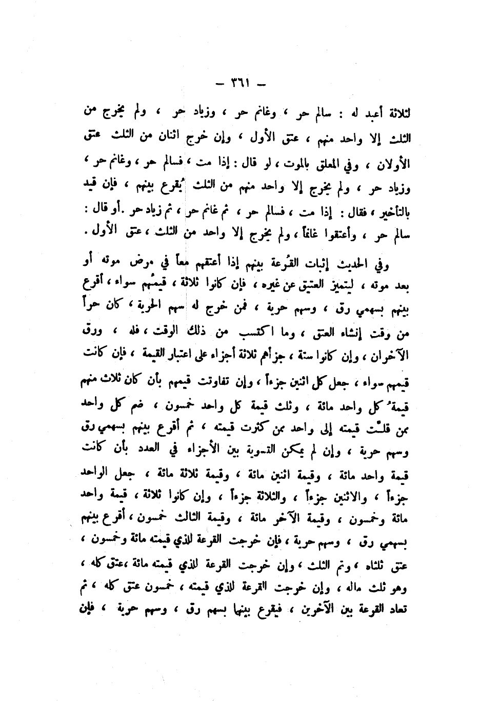 لثَلَاثَة أعبد لَهُ: سَالم حر، وغانم حر، وَزِيَاد حر، وَلم يخرج من الثُّلُث إِلا وَاحِد مِنْهُم، عتق الأول، وَإِن خرج اثْنَان من الثُّلُث عتق الْأَوَّلَانِ، وَفِي الْمُعَلق بِالْمَوْتِ، وَلَو قَالَ: إِذا مت، فسالم حر، وغانم حر، وَزِيَاد حر، وَلم يخرج إِلا وَاحِد مِنْهُم من الثُّلُث يُقرع بَينهم، فَإِن قيد بِالتَّأْخِيرِ، فَقَالَ: إِذا مت، فسالم حر، ثُمَّ غَانِم حر، ثُمَّ زِيَاد حر، أَو قَالَ: سَالم حر، وأعتقوا غانما، وَلم يخرج إِلا وَاحِد من الثُّلُث، عتق الأول.