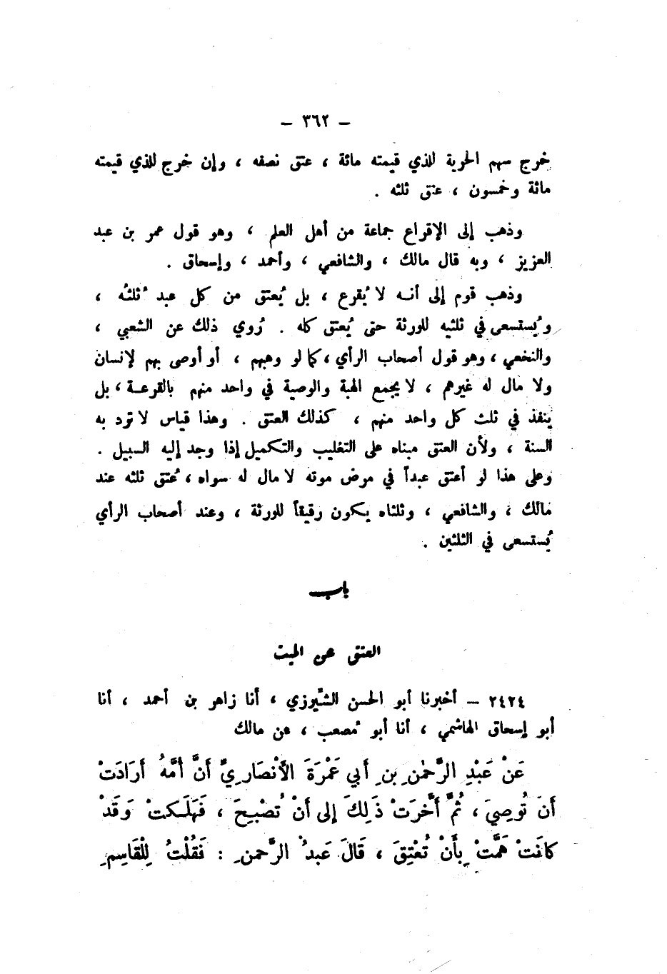 2424 - أَخْبَرَنَا أَبُو الْحَسَنِ الشِّيرَزِيُّ، أَنا زَاهِرُ بْنُ أَحْمَدَ، أَنا أَبُو إِسْحَاقَ الْهَاشِمِيّ، أَنا أَبُو مُصْعَبٍ، عَنْ مَالِكٍ، عَنْ عَبْدِ الرَّحْمَنِ بْنِ أَبِي عَمْرَةَ الأنْصَارِيِّ، أَنَّ أُمَّهُ أَرَادَتْ أَنْ تُوصِيَ، ثُمَّ أَخَّرَتْ ذَلِكَ إِلَى أَنْ تُصْبِحَ، فَهَلَكَتْ، وَقَدْ كَانَتْ هَمَّتْ بِأَنْ تُعْتِقَ، قَالَ عَبْدُ الرَّحْمَنِ: فَقُلْتُ لِلْقَاسِمِ