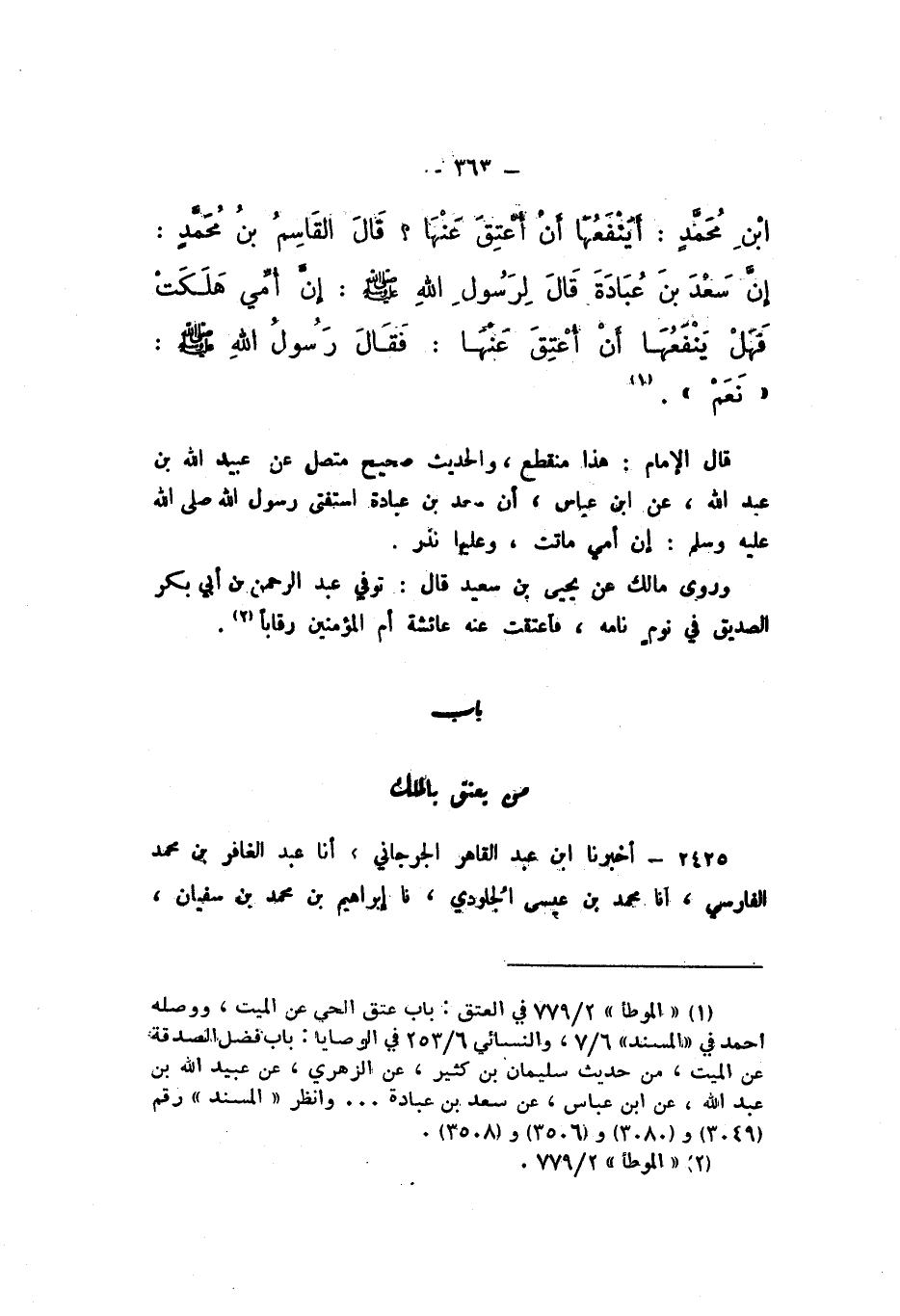 بْنِ مُحَمَّدٍ: أَيَنْفَعُهَا أَنْ أُعْتِقَ عَنْهَا؟ قَالَ الْقَاسِمُ بْنُ مُحَمَّدٍ: إِنَّ سَعْدَ بْنَ عُبَادَةَ، قَالَ لِرَسُولِ اللَّهِ: إنَّ أُمِّي هَلَكَتْ، فَهَلْ يَنْفَعُهَا أَنْ أُعْتِقَ عَنْهَا؟ فَقَالَ رَسُولُ اللَّهِ صَلَّى اللهُ عَلَيْهِ وَسَلَّمَ: «نَعَمْ».