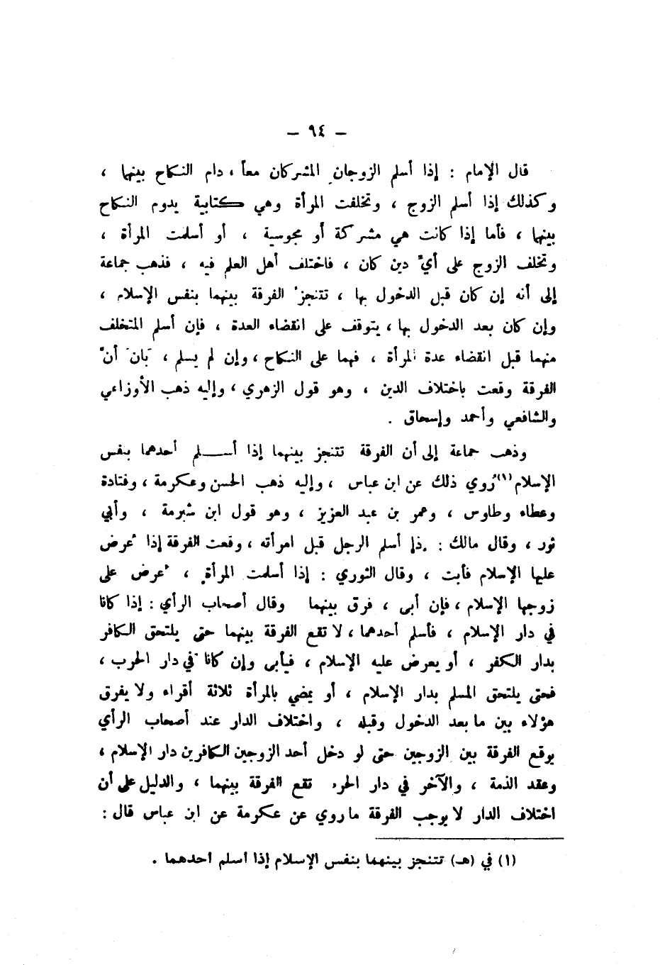 قَالَ الإِمَامُ: إِذا أسلم الزَّوْجَانِ المشركان مَعًا، دَامَ النِّكَاح بَينهمَا، وَكَذَلِكَ إِذا أسلم الزَّوْج، وَتَخَلَّفت الْمَرْأَة وَهِي كِتَابِيَّة يَدُوم النِّكَاح بَينهمَا، فَأَما إِذا كَانَت هِيَ مُشركَة أَو مَجُوسِيَّة، أَو أسلمت الْمَرْأَة، وتخلف الزَّوْج على أيِّ دين كَانَ، فَاخْتلف أهل الْعلم فِيهِ، فَذهب جمَاعَة إِلَى أَنَّهُ إِن كَانَ قبل الدُّخُول بهَا تتنجزُ الْفرْقَة بَينهمَا بِنَفس الْإِسْلَام، وَإِن كَانَ بعد الدُّخُول بهَا، يتَوَقَّف على انْقِضَاء الْعدة، فَإِن أسلم المتخلف مِنْهُمَا قبل انْقِضَاء عدَّة الْمَرْأَة، فهما على النِّكَاح، وَإِن لم يسلم، بَان أنَّ الْفرْقَة وَقعت باخْتلَاف الدَّين، وَهُوَ قَول الزُّهْرِيّ، وَإِلَيْهِ ذهب الأَوْزَاعِيّ، وَالشَّافِعِيّ، وَأَحْمَد، وَإِسْحَاق.