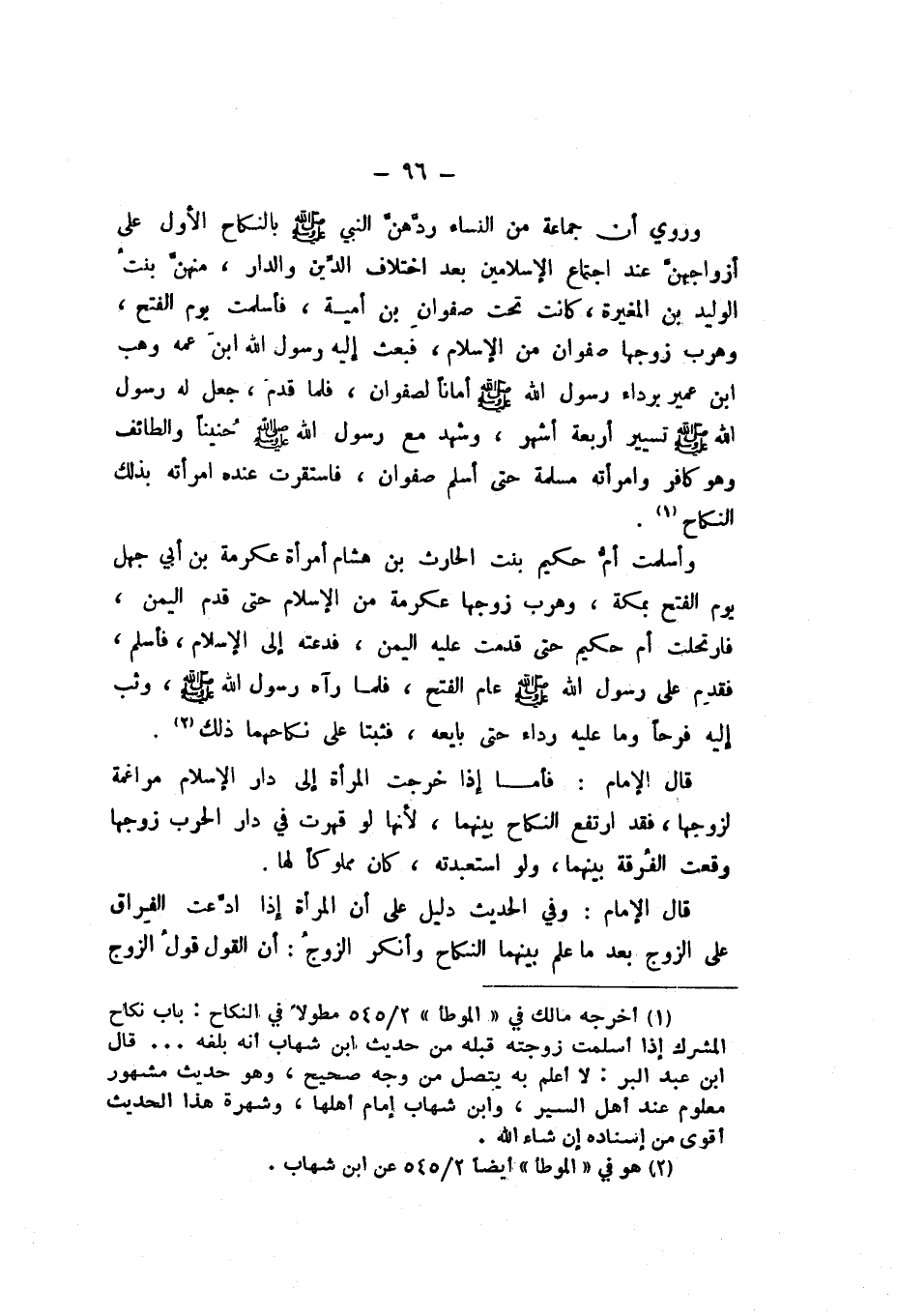 وَرُوِيَ أَن جمَاعَة من النِّسَاء» ردَّهنَّ النَّبِيّ صَلَّى اللهُ عَلَيْهِ وَسَلَّمَ بِالنِّكَاحِ الأول على أزواجهنَّ " عِنْد اجْتِمَاع الإسلامين بعد اخْتِلَاف الدِّين وَالدَّار، منهنَّ: بنتُ الْوَلِيد بْن الْمُغيرَة، كَانَت تَحت صَفْوَان بْن أُميَّة، فَأسْلمت يَوْم الْفَتْح، وهرب زَوجهَا صَفْوَان من الْإِسْلَام، فَبعث إِلَيْهِ رَسُولُ اللَّه صَلَّى اللهُ عَلَيْهِ وَسَلَّمَ ابْن عَمه وهب بْن عُمَيْر برداء رَسُولِ اللَّه صَلَّى اللهُ عَلَيْهِ وَسَلَّمَ أَمَانًا لِصَفْوَان، فَلَمَّا قدم، جعل لَهُ رَسُولُ اللَّه صَلَّى اللهُ عَلَيْهِ وَسَلَّمَ تسيير أَرْبَعَة أشهر، وَشهد مَعَ رَسُولَ اللَّه صَلَّى اللهُ عَلَيْهِ وَسَلَّمَ حُنينًا، والطائف وَهُوَ كَافِر، وَامْرَأَته مسلمة حَتَّى أسلم صَفْوَان، فاستقرت عِنْده امْرَأَته بذلك النِّكَاح.