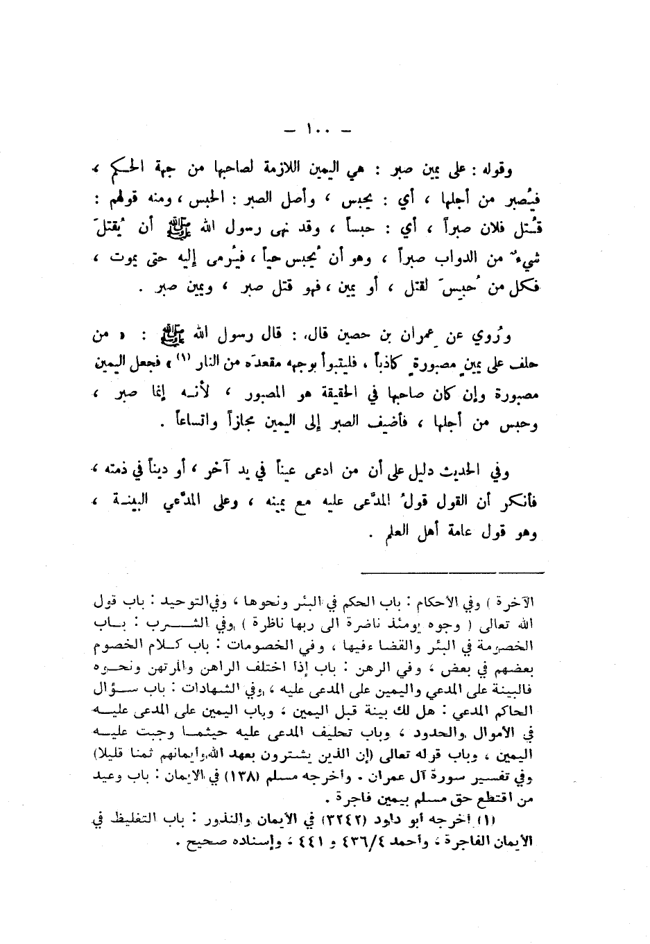 وَرُوِيَ عَنْ عِمْرَانَ بْنِ حُصَيْنٍ، قَالَ: قَالَ رَسُولُ اللَّهِ صَلَّى اللهُ عَلَيْهِ وَسَلَّمَ: «مَنْ حَلَفَ عَلَى يَمِينٍ مَصْبُورَةٍ كَاذِبًا فليَتَبَوَّأْ بِوَجْهِهِ مَقْعَدَهُ مِنَ النَّارِ»، فَجَعَلَ الْيَمِينَ مَصْبُورَةً وَإِنْ كَانَ صَاحِبُهَا فِي الْحَقِيقَةِ هُوَ الْمَصْبُورُ، لأَنَّهُ إِنَّمَا صُبِرَ، وَحُبِسَ مِنْ أَجْلِهَا، فَأُضِيفَ الصَّبْرُ إِلَى الْيَمِينِ مَجَازًا واتِّسَاعًا.