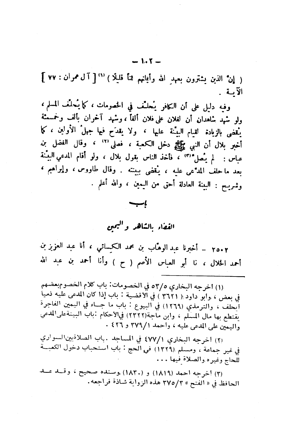 وَفِيهِ دَلِيلٌ عَلَى أَنَّ الْكَافِرَ يُحَلَّفُ فِي الْخُصُومَاتِ، كَمَا يُحَلَّفُ الْمُسْلِمُ، وَلَوْ شَهِدَ شَاهِدَانِ أَنَّ لِفُلانٍ عَلَى فُلانٍ أَلْفًا، وَشَهِدَ آخَرَانِ بِأَلْفٍ وَخَمْسِ مِائَةٍ، يُقْضَى بِالزِّيَادَةِ لِقِيَامِ الْبَيِّنَةِ عَلَيْهَا، وَلا يَقْدَحُ فِيهَا جَهْلُ الأَوَّلَيْنِ، كَمَا أَخْبَرَ بِلالٌ أَنَّ النَّبيَّ صَلَّى اللهُ عَلَيْهِ وَسَلَّمَ «دَخَلَ الكَعْبَةَ، فَصَلَّى»، وَقَالَ الْفَضْلُ بْنُ عَبَّاسٍ: لَمْ يُصَلِّ.