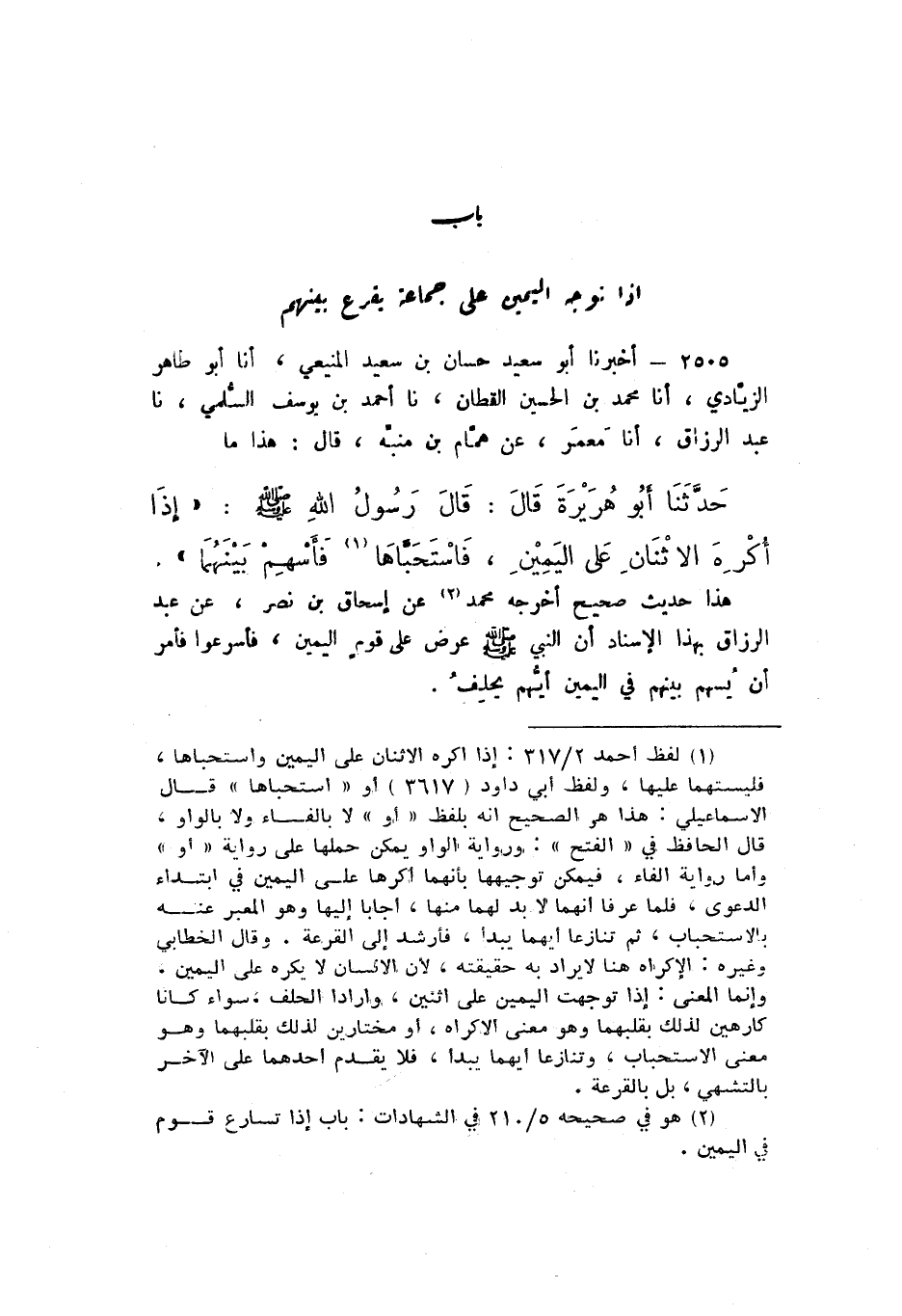 2505 - أَخْبَرَنَا أَبُو سَعِيدٍ حَسَّانُ بْنُ سَعِيدٍ الْمَنِيعِيُّ، أَنا أَبُو طَاهِرٍ الزِّيَادِيُّ، أَنا مُحَمَّدُ بْنُ الْحُسَيْنِ الْقَطَّانُ، نَا أَحْمَدُ بْنُ يُوسُفَ السُّلَمِيُّ، نَا عَبْدُ الرَّزَّاقِ، أَنا مَعْمَرٌ، عَنْ هَمَّامِ بْنِ مُنَبِّهٍ، قَالَ: هَذَا مَا حَدَّثَنَا أَبُو هُرَيْرَةَ، قَالَ: قَالَ رَسُولُ اللَّهِ صَلَّى اللهُ عَلَيْهِ وَسَلَّمَ: «إِذَا أُكْرِهَ الاثْنَانِ عَلَى الْيَمِينِ، فَاسْتَحَبَّاهَا فَأَسْهِمْ بَيْنَهُمَا».