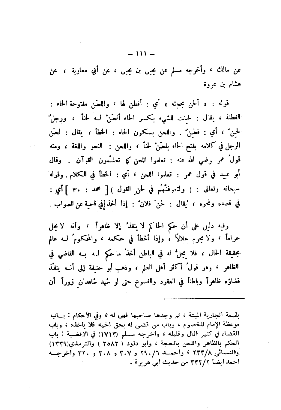 وَفِيهِ دَلِيلٌ عَلَى أَنَّ حُكْمَ الْحَاكِمِ لَا يَنْفُذُ إِلا ظَاهِرًا، وَأَنَّهُ لَا يُحِلُّ حَرَامًا، وَلا يُحَرِّمُ حَلالا، وَإِذَا أَخْطَأَ فِي حُكْمِهِ، وَالْمَحْكُومُ لَهُ عَالِمٌ بِحَقِيقَةِ الْحَالَ، فَلا يَحِلُّ لَهُ فِي الْبَاطِنِ أَخْذُ مَا حَكَمَ لَهُ بِهِ الْقَاضِي فِي الظَّاهِرِ، وَهُوَ قَوْلُ أَكْثَرِ أَهْلِ الْعِلْمِ، وَذَهَبَ أَبُو حَنِيفَةَ إِلَى أَنَّهُ يَنْفُذُ قَضَاؤُهُ ظَاهِرًا أَوْ بَاطِنًا فِي الْعُقُودِ وَالْفسُوخِ حَتَّى لَوْ شَهِدَ شَاهِدَانِ زُورًا أَنَّ