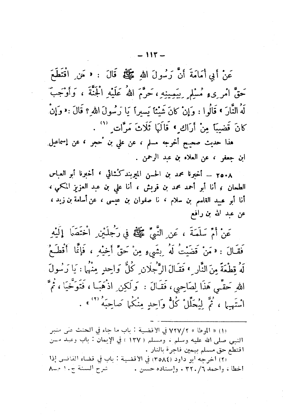 2508 - أَخْبَرَنَا مُحَمَّدُ بْنُ الْحَسَنِ الْمِيرْبَنْدُ كُشَائِيُّ، أَخْبَرَنَا أَبُو الْعَبَّاسِ الطَّحَّانُ، أَنا أَبُو أَحْمَدَ مُحَمَّدُ بْنُ قُرَيْشٍ، أَنا عَلِيُّ بْنُ عَبْدِ الْعَزِيزِ الْمَكِّيُّ، أَنا أَبُو عُبَيْدٍ الْقَاسِمُ بْنُ سَلامٍ، نَا صَفْوَانُ بْنُ عِيسَى، عَنْ أُسَامَةَ بْنِ زَيْدٍ، عَنْ عَبْدِ اللَّهِ بْنِ رَافِعٍ، عَنْ أُمِّ سَلَمَةَ، عَنِ النَّبيِّ صَلَّى اللهُ عَلَيْهِ وَسَلَّمَ فِي رَجُلَيْنِ اخْتَصَمَا إِلَيْهِ، فَقَالَ: «مَنْ قَضَيْتُ لَهُ بِشَيْءٍ مِنْ حَقِّ أَخِيهِ، فَإِنَّمَا أَقْطَعُ لَهُ قِطْعَةً مِنَ النَّارِ»، فَقَالَ الرَّجُلانِ كلٌّ وَاحِدٍ مِنْهُمَا: يَا رَسُولَ اللَّهِ، حَقِّي هَذَا لِصَاحِبِي، فَقَالَ: «وَلَكِنِ اذْهَبَا فَتَوَخَّيَا، ثُمَّ اسْتَهِمَا، ثُمَّ لِيُحْلِلْ كُلُّ وَاحِدٍ مِنْكُمَا صَاحِبَهُ»