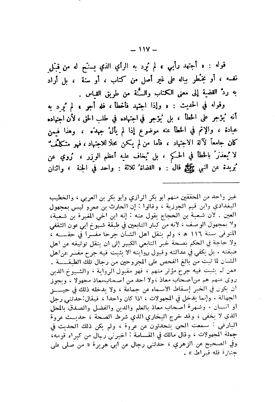وَقَوْلُهُ فِي الْحَدِيثِ: «وَإِذَا اجتَهَدَ فأَخْطَأَ، فَلَهُ أَجْرٌ» لَمْ يُرِدْ بِهِ أَنَّهُ يُؤْجَرُ عَلَى الْخَطَإِ، بَلْ يُؤْجَرُ فِي اجْتِهَادِهِ طَلَبَ الْحَقِّ، لأَنَّ اجْتِهَادَهُ عِبَادَةٌ، وَالإِثْمُ فِي الْخَطَإِ عَنْهُ مَوْضُوعٌ إِذَا لَمْ يَأْلُ جُهْدَهُ، وَهَذَا فِيمَنْ كَانَ جَامِعًا لآلَةِ الاجْتِهَادِ، فَأَمَّا مَنْ لَمْ يَكُنْ مَحَلا لِلاجْتِهَادِ، فَهُوَ مُتَكَلِّفٌ لَا يُعْذَرُ بِالْخَطَإِ فِي الْحُكْمِ، بَلْ يُخَافُ عَلَيْهِ أَعْظَمُ الْوِزْرِ، رُوِيَ عَنْ بُرَيْدَةَ، عَنِ النَّبِيِّ صَلَّى اللهُ عَلَيْهِ وَسَلَّمَ، قَالَ: " القُضَاةُ ثَلاثَةٌ: وَاحِدٌ فِي الْجَنَّةِ، وَاثْنَانِ