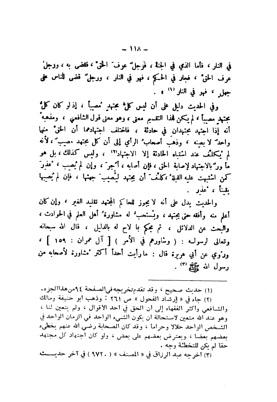 وَفِي هَذَا الْحَدِيثِ دَلِيلٌ عَلَى أَنْ لَيْسَ كُلُّ مُجْتَهِدٍ مُصِيبًا، إِذْ لَوْ كَانَ كلُّ مُجْتَهِدٍ مُصِيبًا، لَمْ يَكُنْ لِهَذَا التَّقْسِيمِ مَعْنًى، وَهُوَ مَعْنَى قَوْلِ الشَّافِعِيِّ، وَمَذْهَبُهُ أَنَّهُ إِذَا اجْتَهَدَ مُجْتَهِدَانِ فِي حَادِثَةٍ فَاخْتَلَفَ اجْتِهَادُهُمَا، أَنَّ الْحَقَّ مِنْهُمَا وَاحِدٌ لَا بِعَيْنِهِ، وَذَهَبَ أَصْحَابُ الرَّأْيِ إِلَى أَنَّ كُلَّ مُجْتَهِدٍ مُصِيبٌ، لأَنَّهُ لَمْ يُكَلَّفْ عِنْدَ اشْتِبَاهِ الْحَادِثَةِ إِلا الاجْتِهَادَ، وَلَيْسَ كَذَلِكَ، بَلْ هُوَ مَأْمُورٌ بِالاجْتِهَادِ لإِصَابَةِ الْحَقِّ، فَإِنْ أَصَابَهُ أُجِرَ، وَإِنْ لَمْ يُصِبْ عُذِرَ، كَمَنِ اشْتَبَهَتْ عَلَيْهِ الْقِبْلَةُ، كُلِّفَ أَنْ يَجْتَهِدَ لِيُصِيبَ جِهَتَهَا، فَإِنْ لَمْ يُصِبْهَا يَقِينًا عُذِرَ.