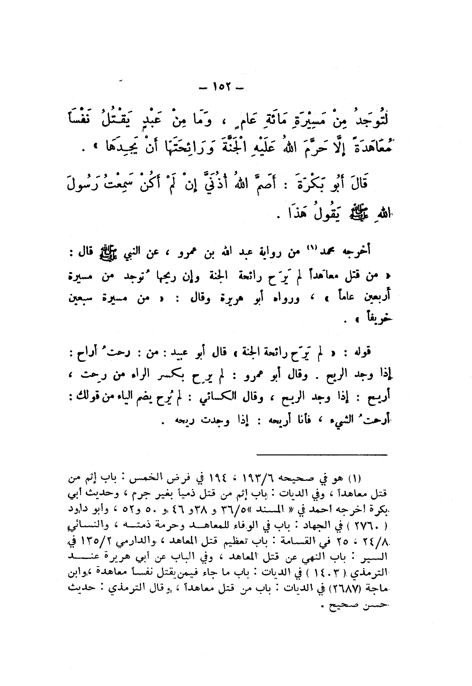 أَخْرَجَهُ مُحَمَّدٌ مِنْ رِوَايَةِ عَبْدِ اللَّهِ بْنِ عَمْرٍو، عَنِ النَّبِيِّ صَلَّى اللهُ عَلَيْهِ وَسَلَّمَ، قَالَ: «مَنْ قَتَلَ مُعَاهدًا لَمْ يَرَحْ رَائِحَةَ الْجَنَّةِ، وَإِنَّ رِيحَهَا تُوجَدُ مِنْ مَسِيرَةِ أَرْبَعِينَ عَامًا»، وَرَوَاهُ أَبُو هُرَيْرَةَ، وَقَالَ: «مِنْ مَسِيرَةِ سَبْعِينَ خَرِيفًا».