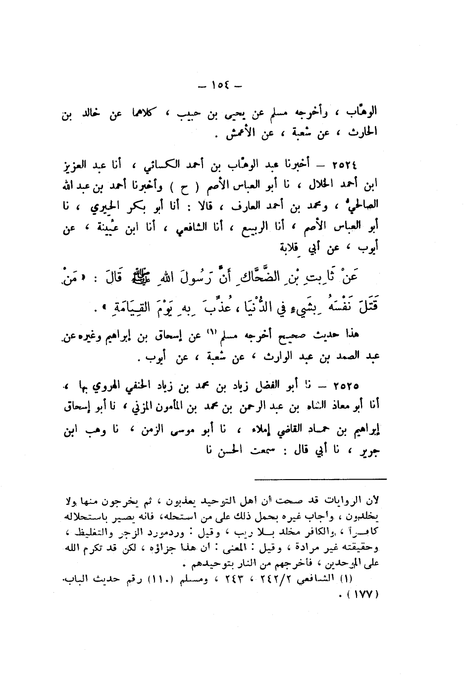 ح، وأَخْبَرَنَا أَحْمَدُ بْنُ عَبْدِ اللَّهِ الصَّالِحِيُّ، وَمُحَمَّدُ بْنُ أَحْمَدَ الْعَارِفُ، قَالا: أَنا أَبُو بَكْرٍ الْحِيرِيُّ، نَا أَبُو الْعَبَّاسِ الأَصَمُّ، أَنا الرَّبِيعُ، أَنا الشَّافِعِيُّ، أَنا ابْنُ عُيَيْنَةَ، عَنْ أَيُّوبَ، عَنْ أَبِي قِلابَةَ، عَنْ ثَابِتِ بْنِ الضَّحَّاكِ، أَنَّ رَسُولَ اللَّهِ صَلَّى اللهُ عَلَيْهِ وَسَلَّمَ، قَالَ: «مَنْ قَتَلَ نَفْسَهُ بِشَيْءٍ فِي الدُّنْيَا، عُذِّبَ بِهِ يَوْمَ القِيَامَةِ».
