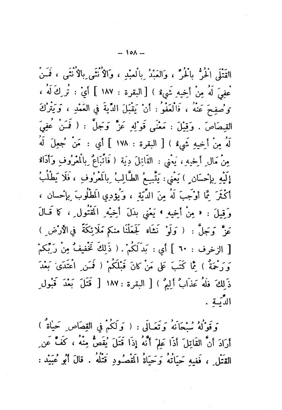 وَقَوْلُهُ سُبْحَانَهُ وَتَعَالَى: {وَلَكُمْ فِي الْقِصَاصِ حَيَاةٌ} [الْبَقَرَة: 179]، أَرَادَ أَنَّ الْقَاتِلَ إِذَا عَلِمَ أَنَّهُ إِذَا قَتَلَ يُقَصُّ مِنْهُ، كَفَّ عَنِ الْقَتْلِ، فَفِيهِ حَيَاتُهُ وَحَيَاةُ الْمَقْصُودِ قَتْلُهُ.